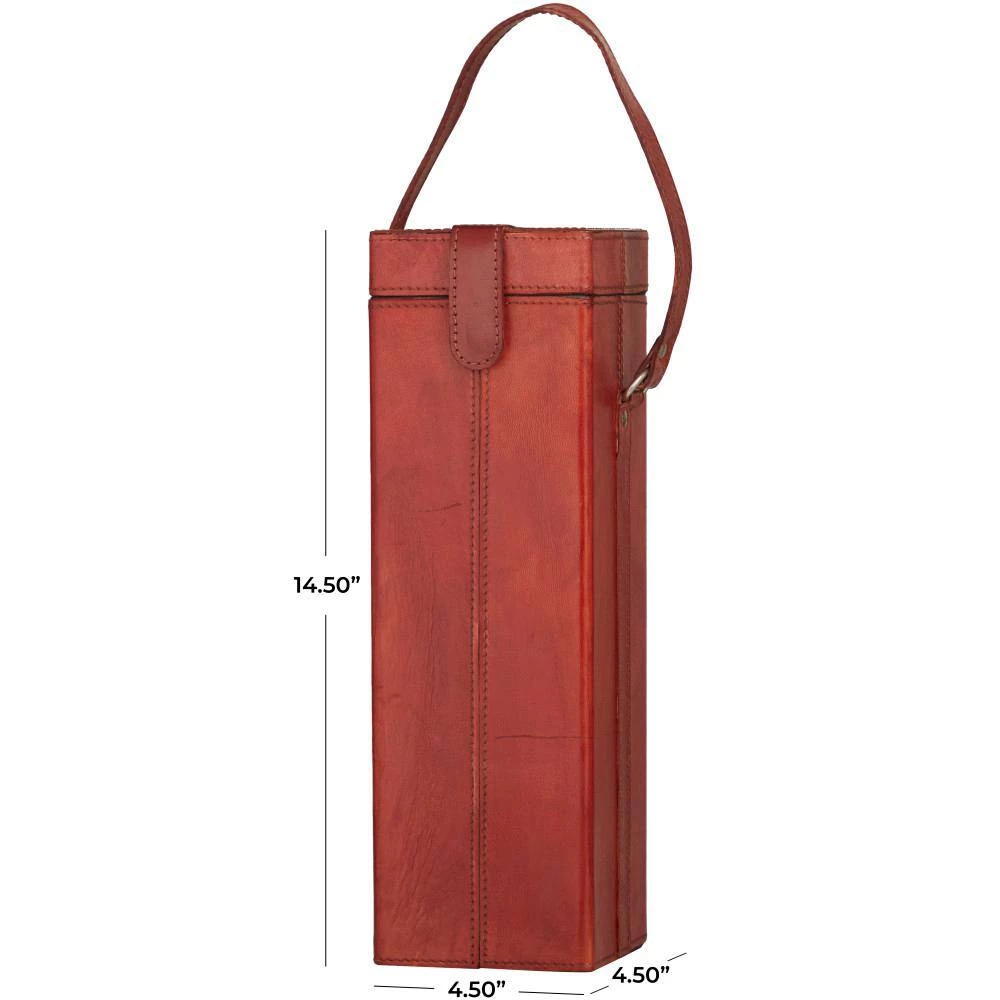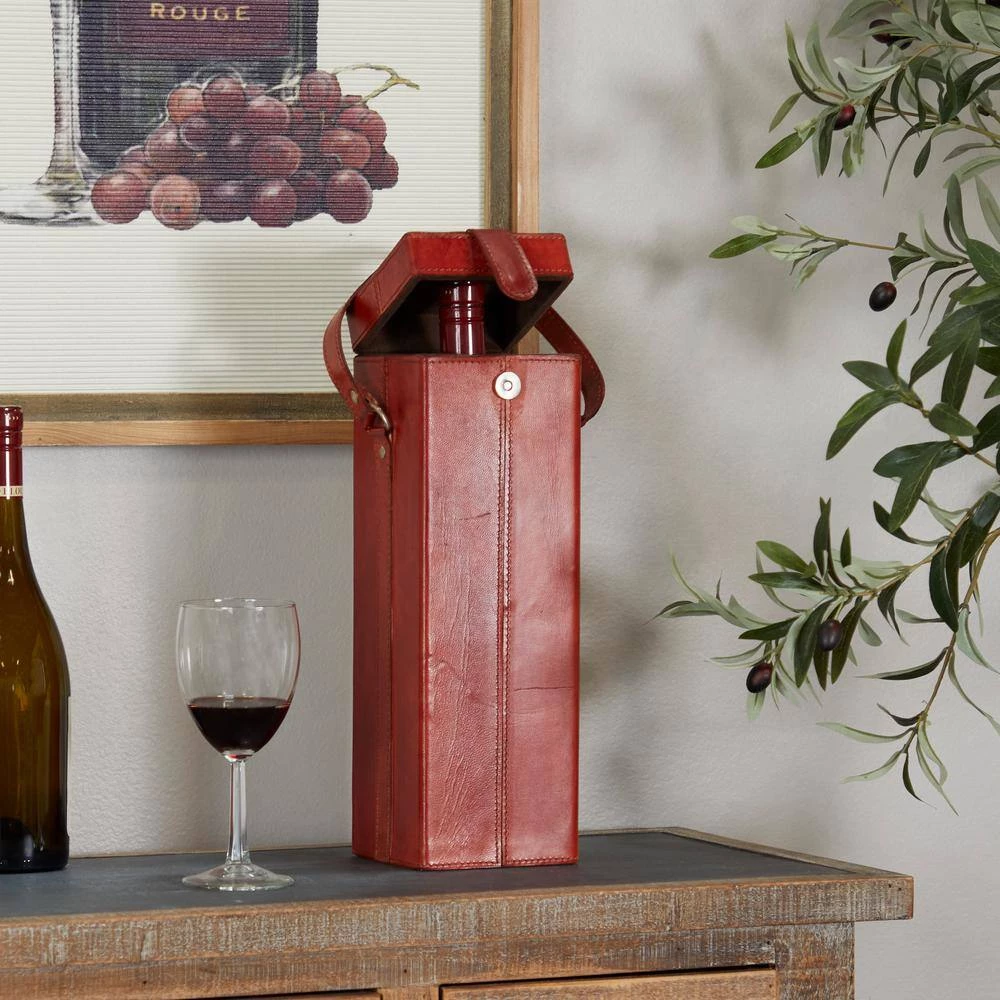 - Our lavish red wine bottle holder showcases a rectangular wood and leather bag structure that has a vintage luggage-inspired design with a magnet strap lock, an easy-carry accent handle, and a fancy suede fabric interior that can secure 1 wine bottle