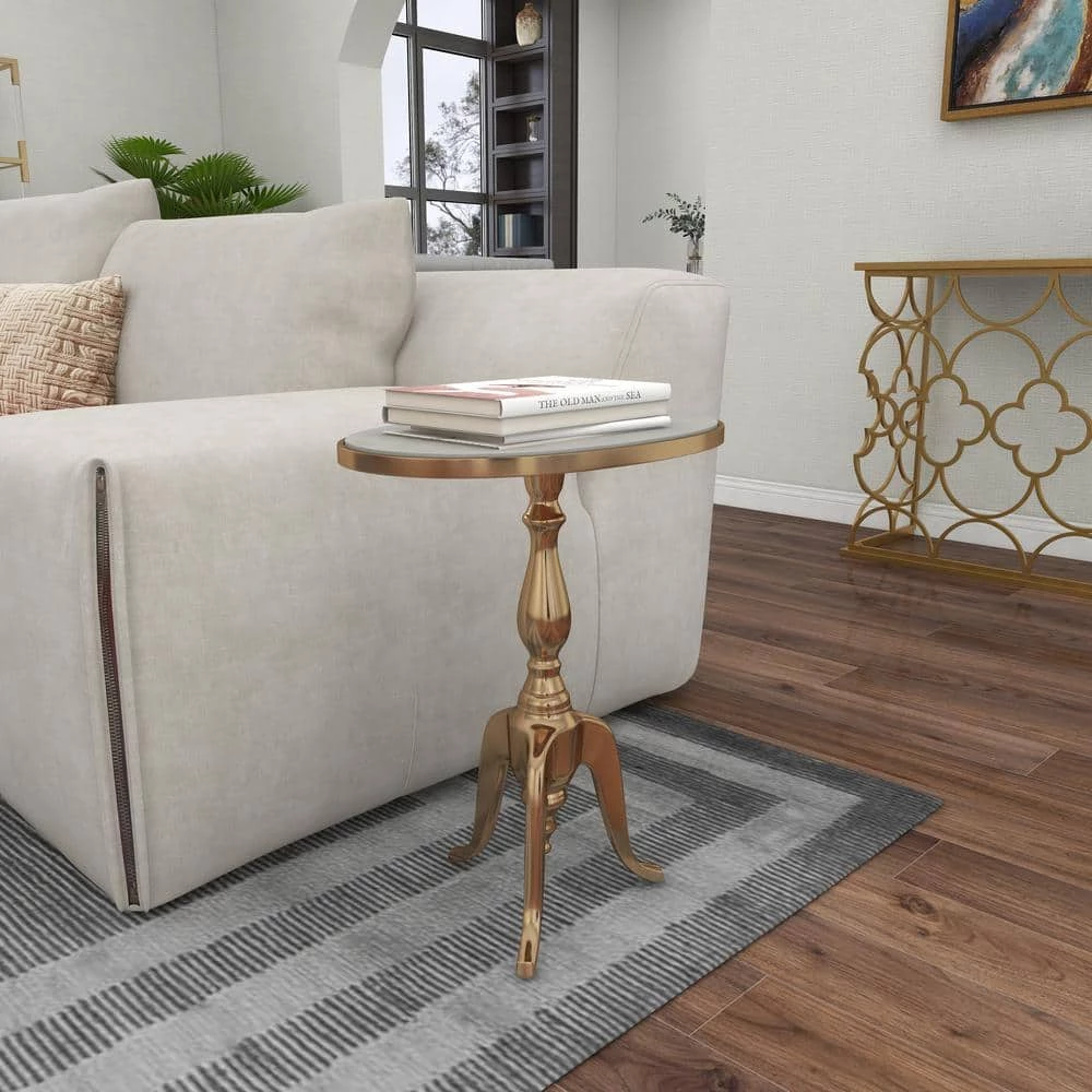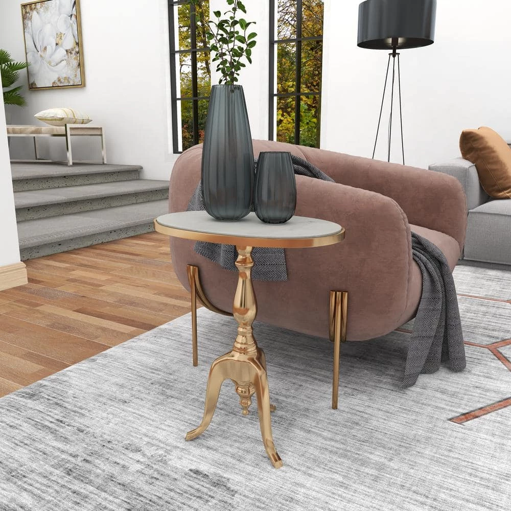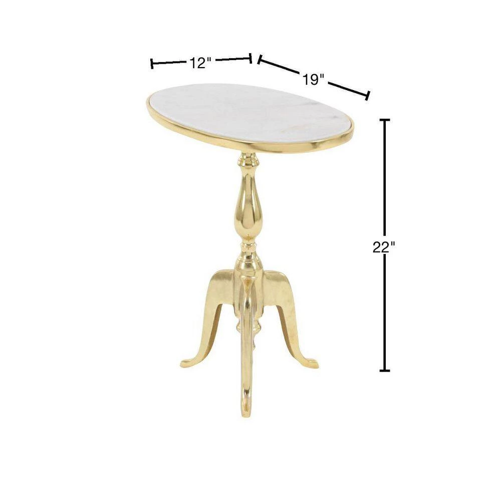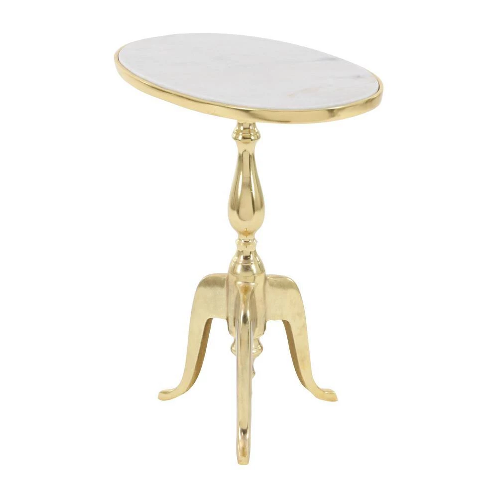 - Oval gold metal accent table features serpentine tripod base with a smooth marble inspired top for immaculate display