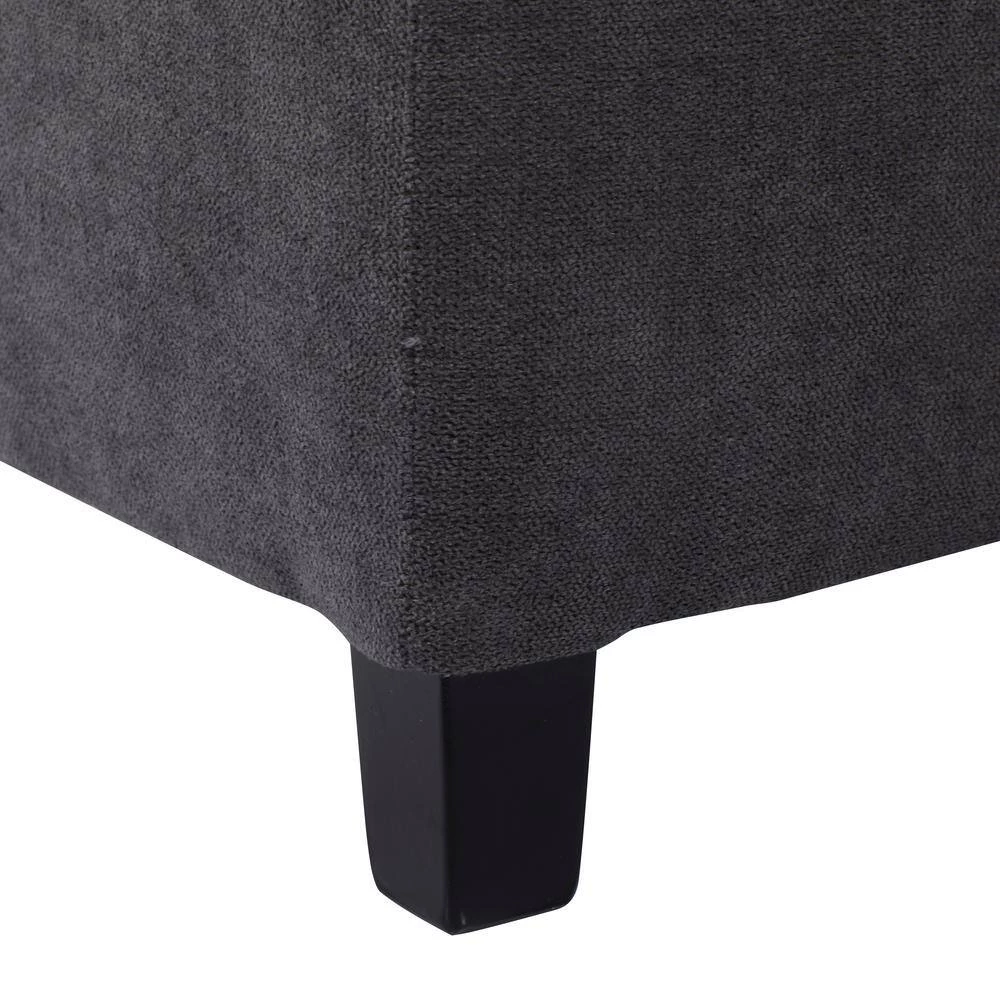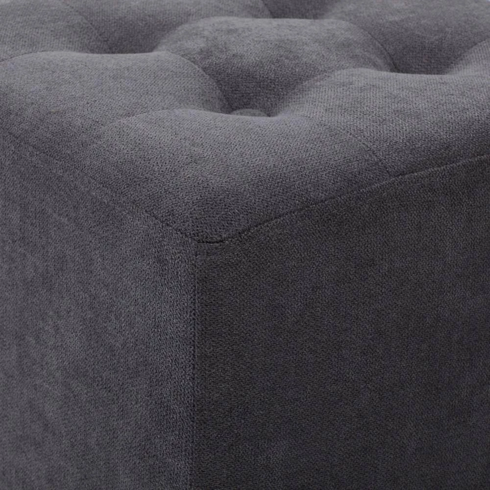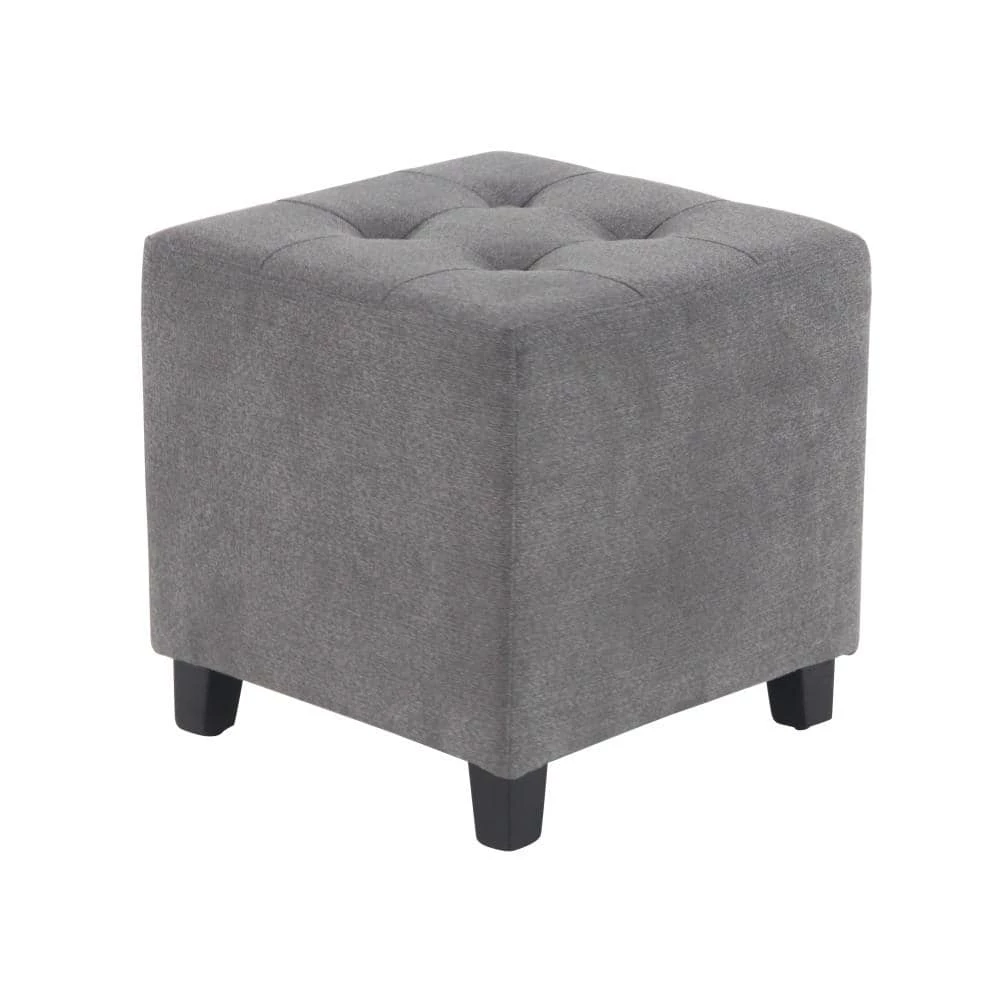 - Grey upholstered stool features a solid square form with soft fabric and tufted top with block style legs