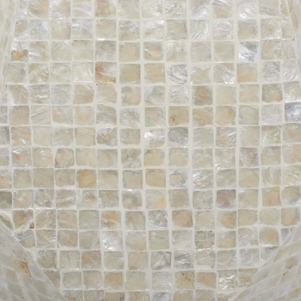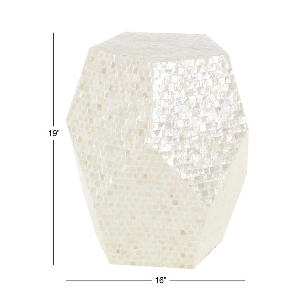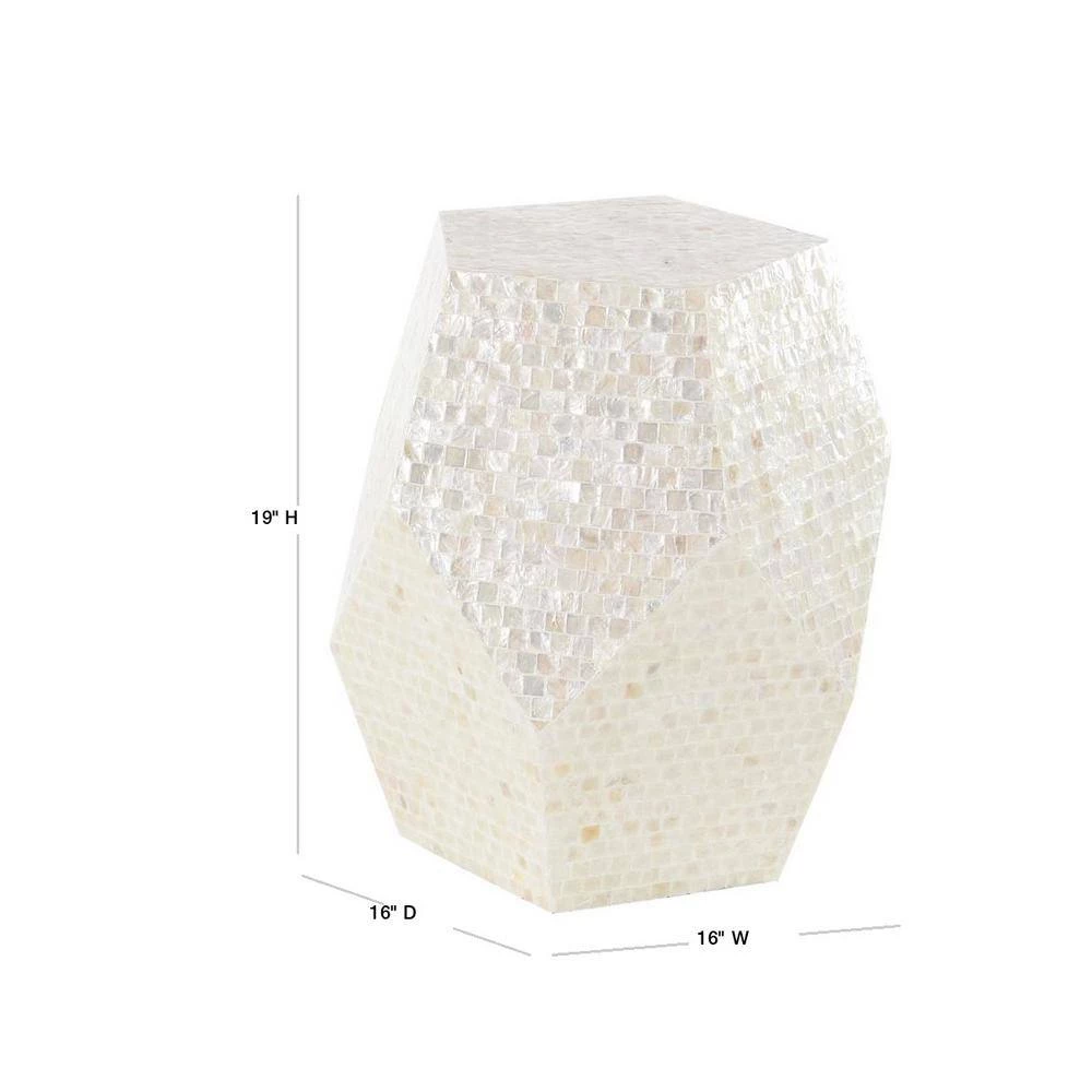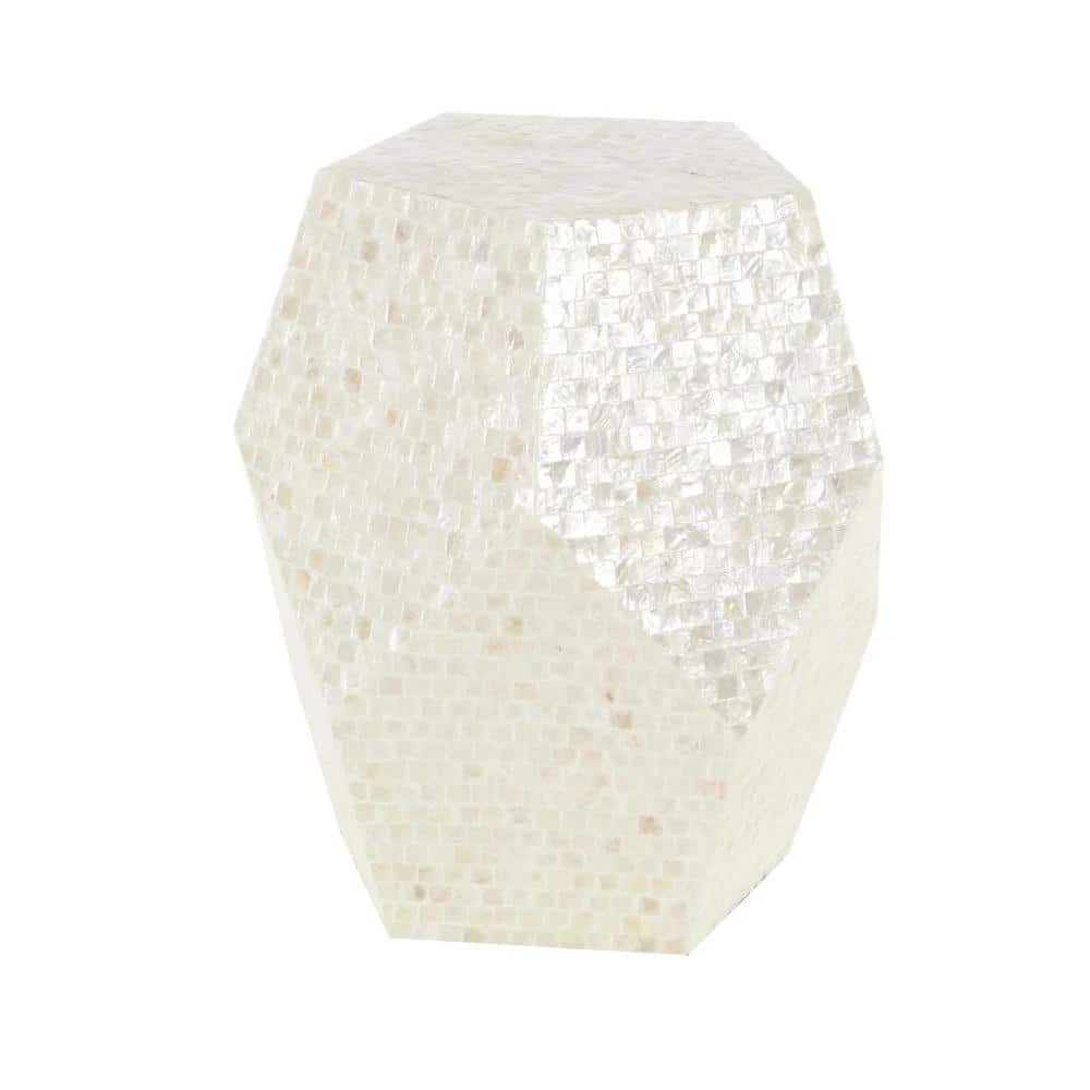 - Faceted accent table carries a pearl white mosaic shell with an iridescent finish