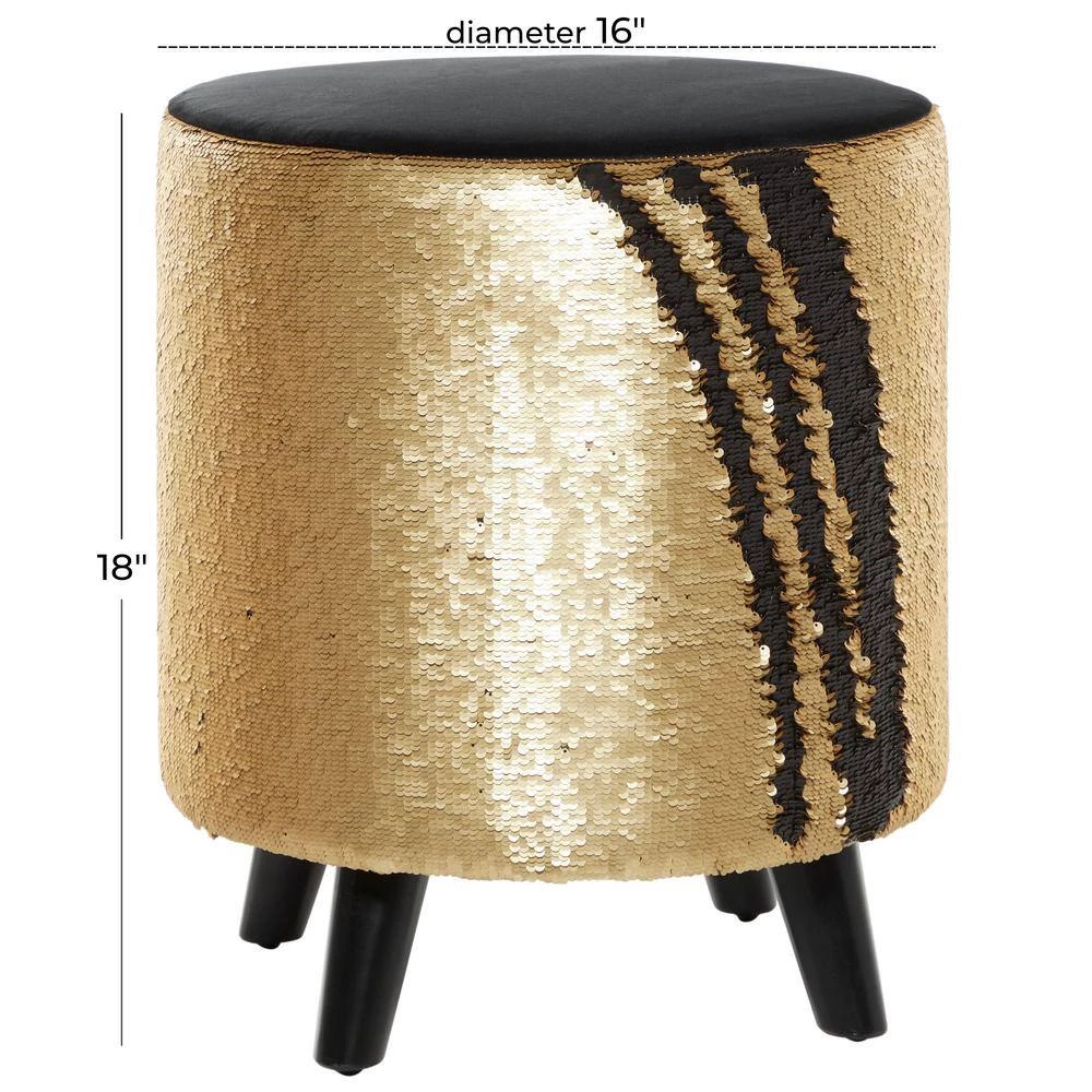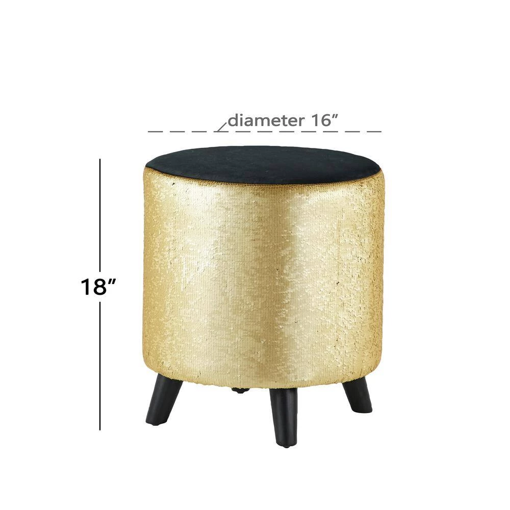 - Gold upholstered stool showcases a round form with reversible sequins in gold and black, and complemented with four tapered legs for exceptional support
