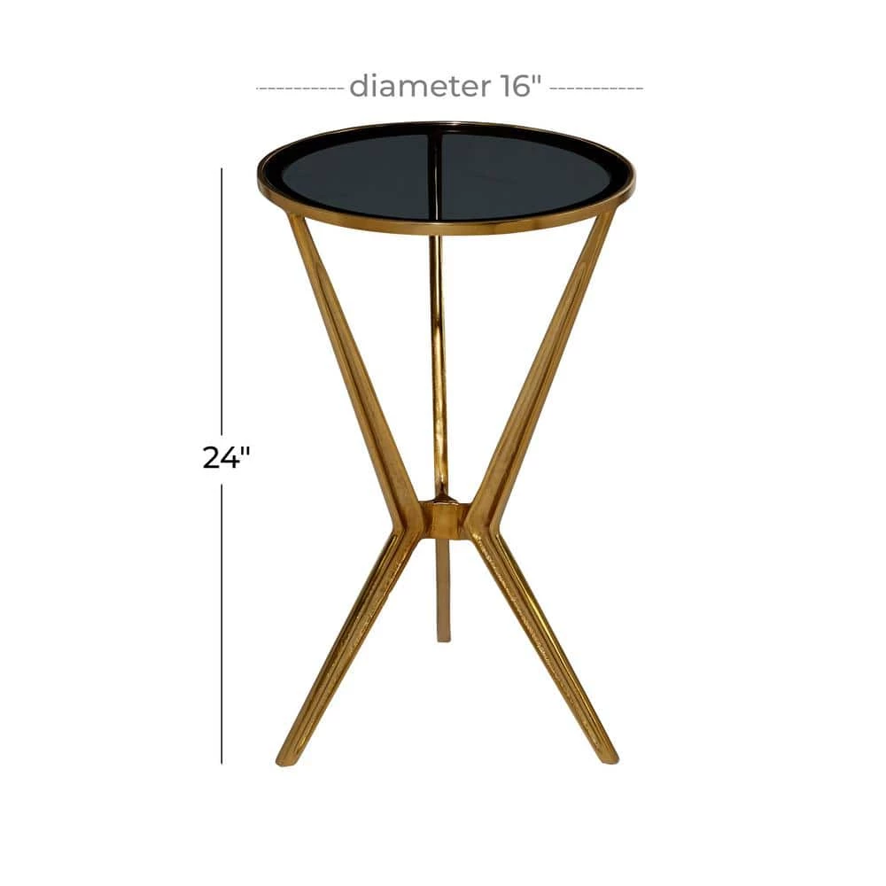 - Round metal side table has a gold finished frame with transparent black top