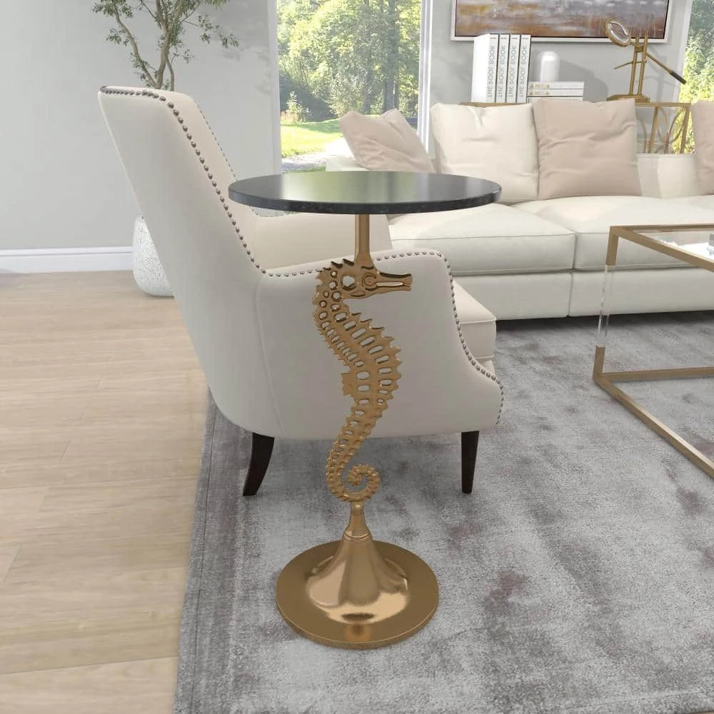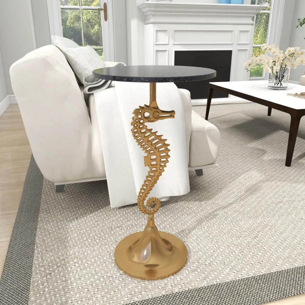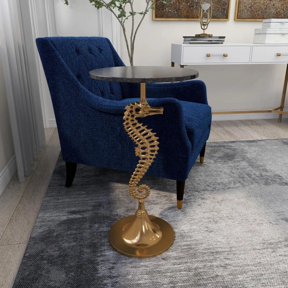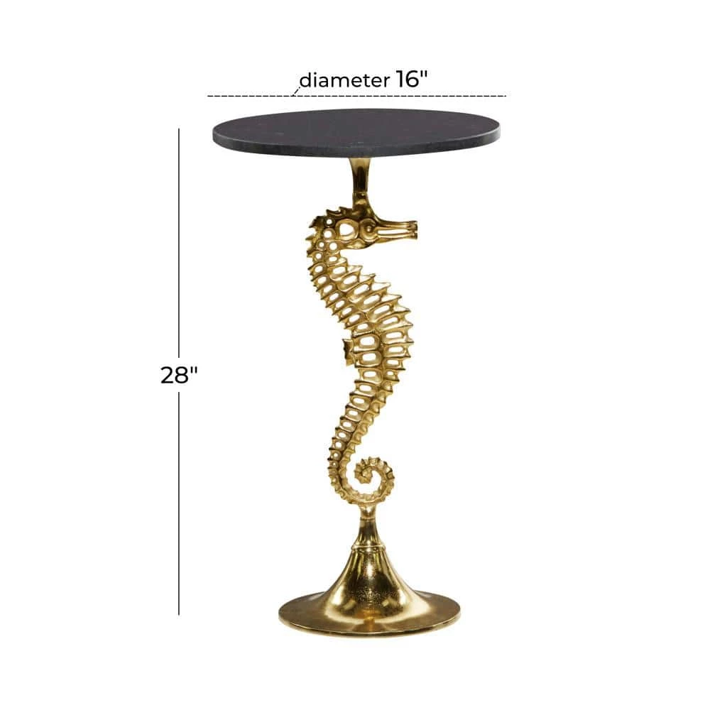 - Captivating large seahorse-inspired accent table is crafted in India and made of shiny aluminum along with solid marble