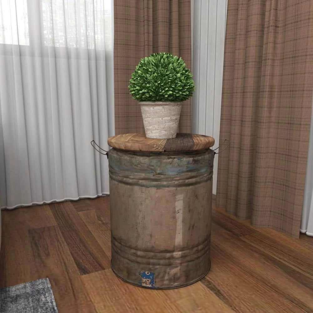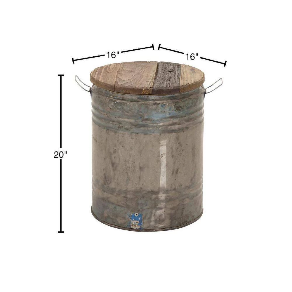 - Barrel style metal side table features spacious interior with metal side handle and a wooden top for discreet storage