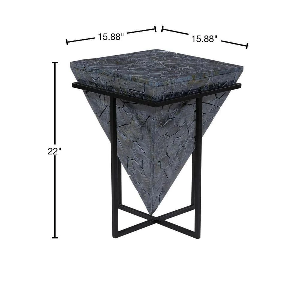 - Very stylish side table that flaunts an inverted pyramid with crack-like design and a frame with a cross base
