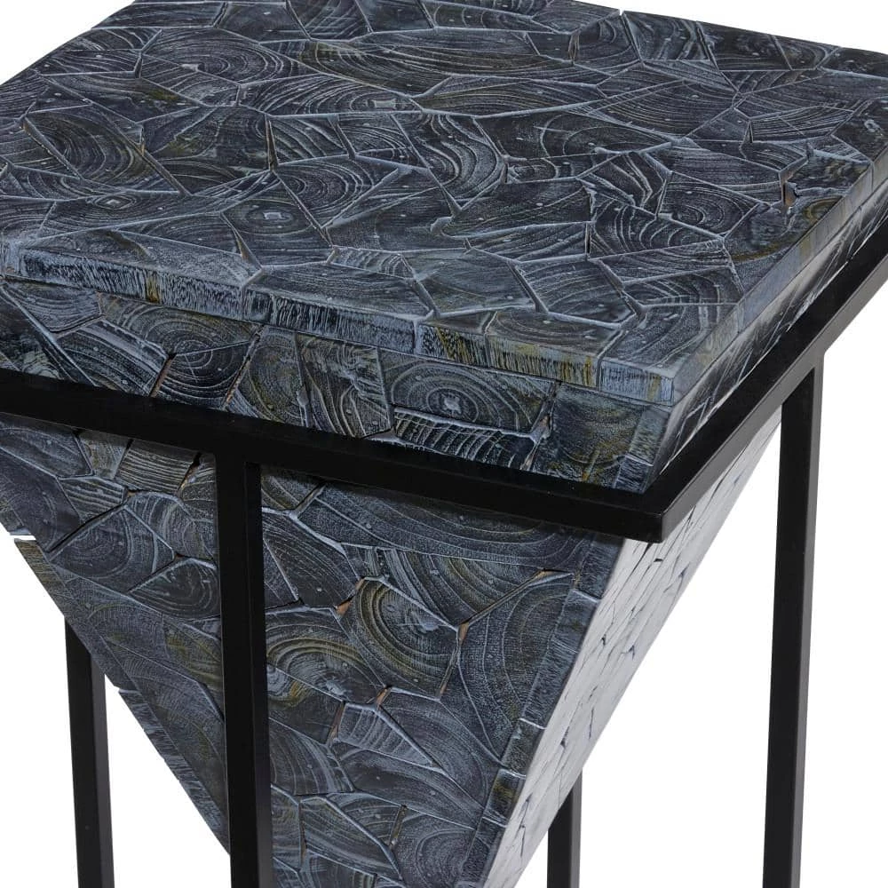 - Natural teak wood chunks are attached together to form an inverted triangle side table