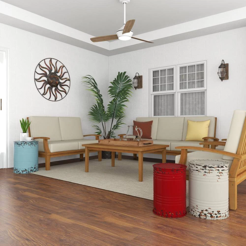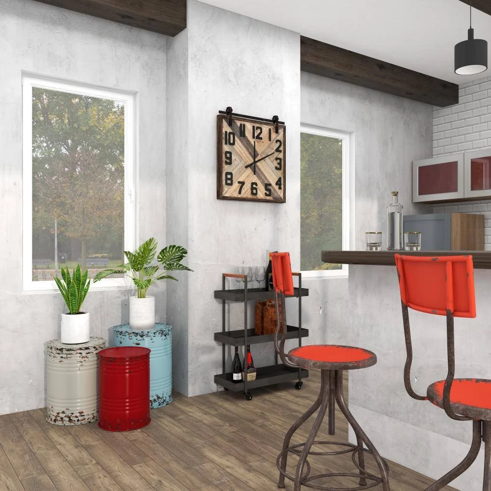 Bring a finishing touch to your home with an inviting appeal with this beautifully crafted accent table. A compact friendly table providing you with additional surface storage space any where in your home. Decorate these drum style side tables with ceramic potted plants, scented candles and books. This item ships in 1 carton. Metal drum silhouettes. Suitable for indoor use only. Maximum weight limit is 100 lbs. Colorful set includes 3 accent tables. Farmhouse theme.