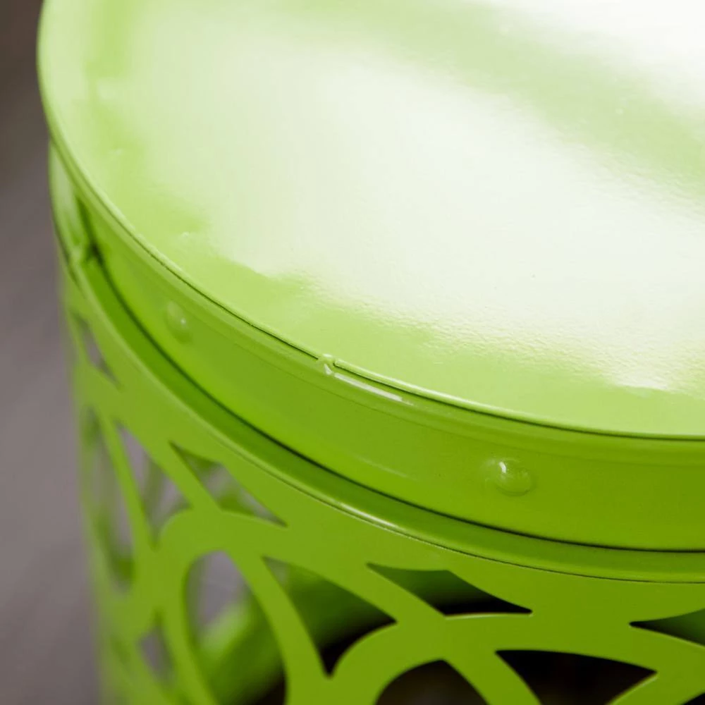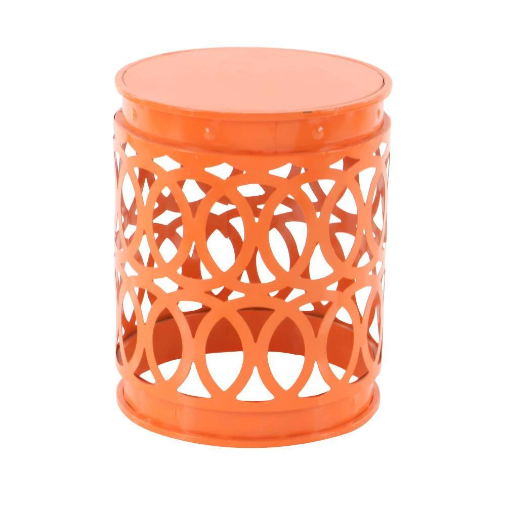 - Each round accent table features rivetted detailing with perforated ring patterns in an open cylindrical structure for optimal storage