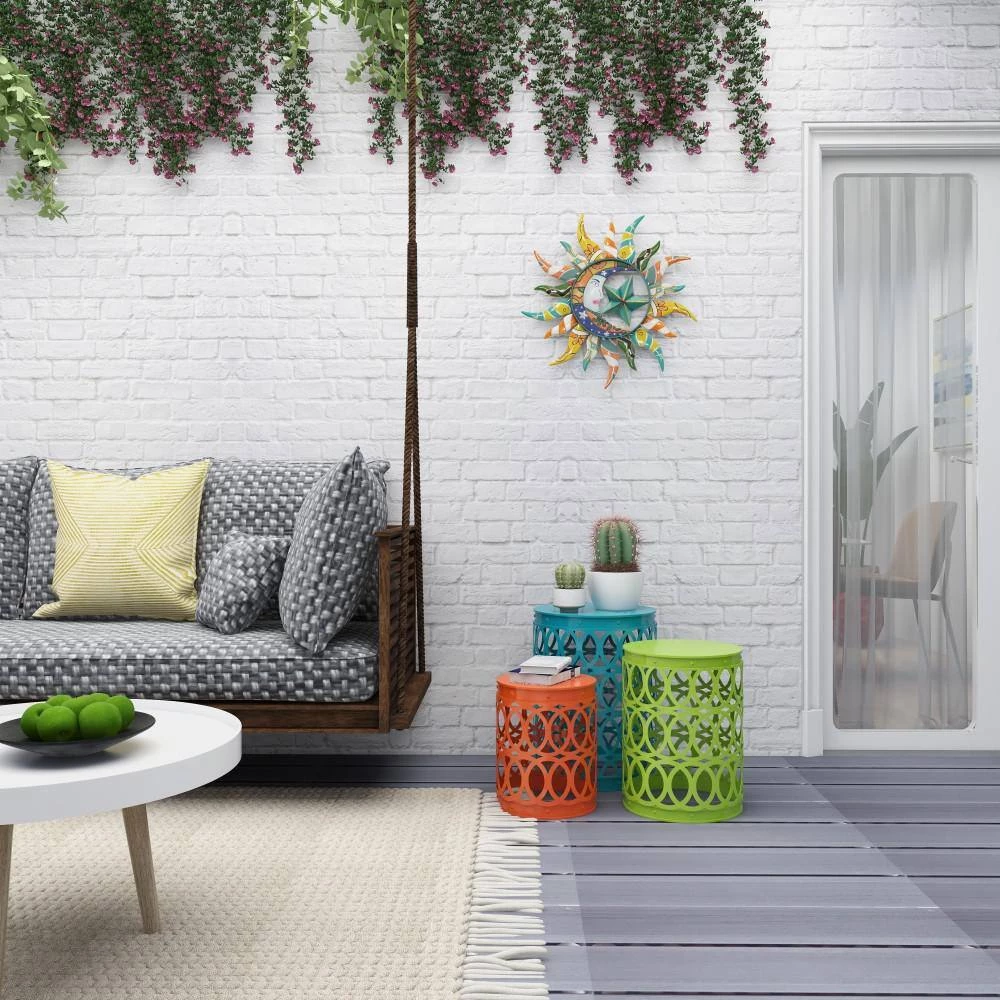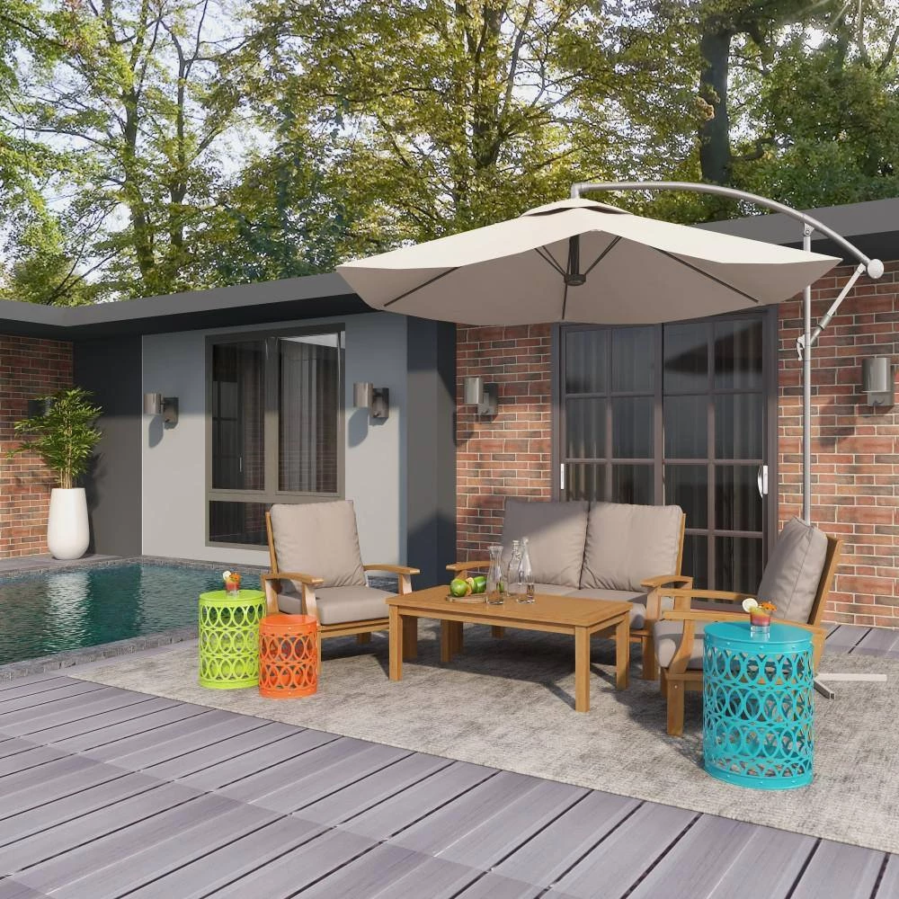 A compact friendly table providing you with additional storage space any where in your home. Place this item on your patio near the pool or garden, or challenge your creativity by brining it inside for individualistic appeal. Add vibrant color and form to your outdoor setting with this trio of accent tables, and place small succulents or plants on top for a playful look. This item ships in 1 carton. Suitable for indoor and outdoor use. Each accent table can support up to 30 lbs. Outdoor accent tables come as a set of 3. Contemporary style.