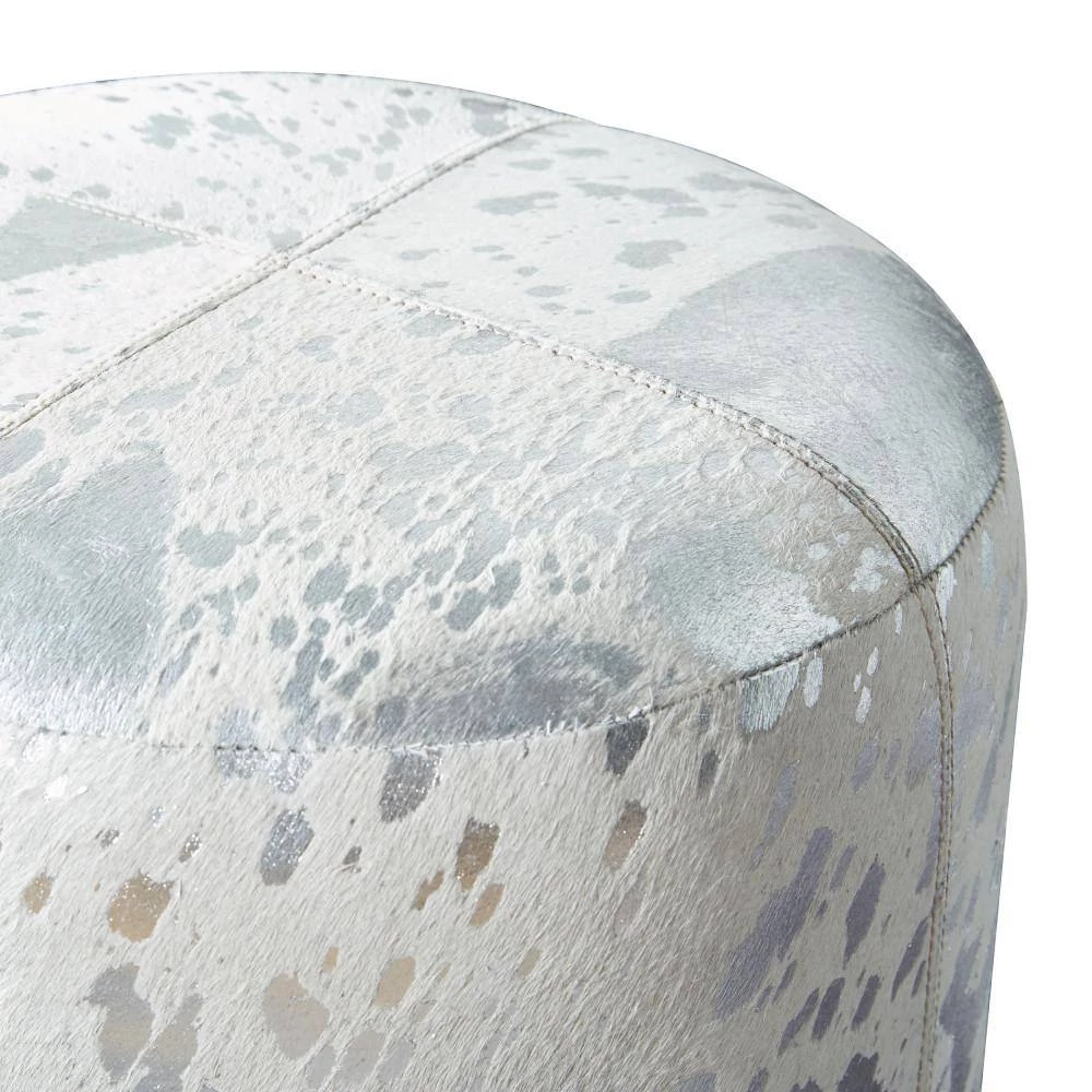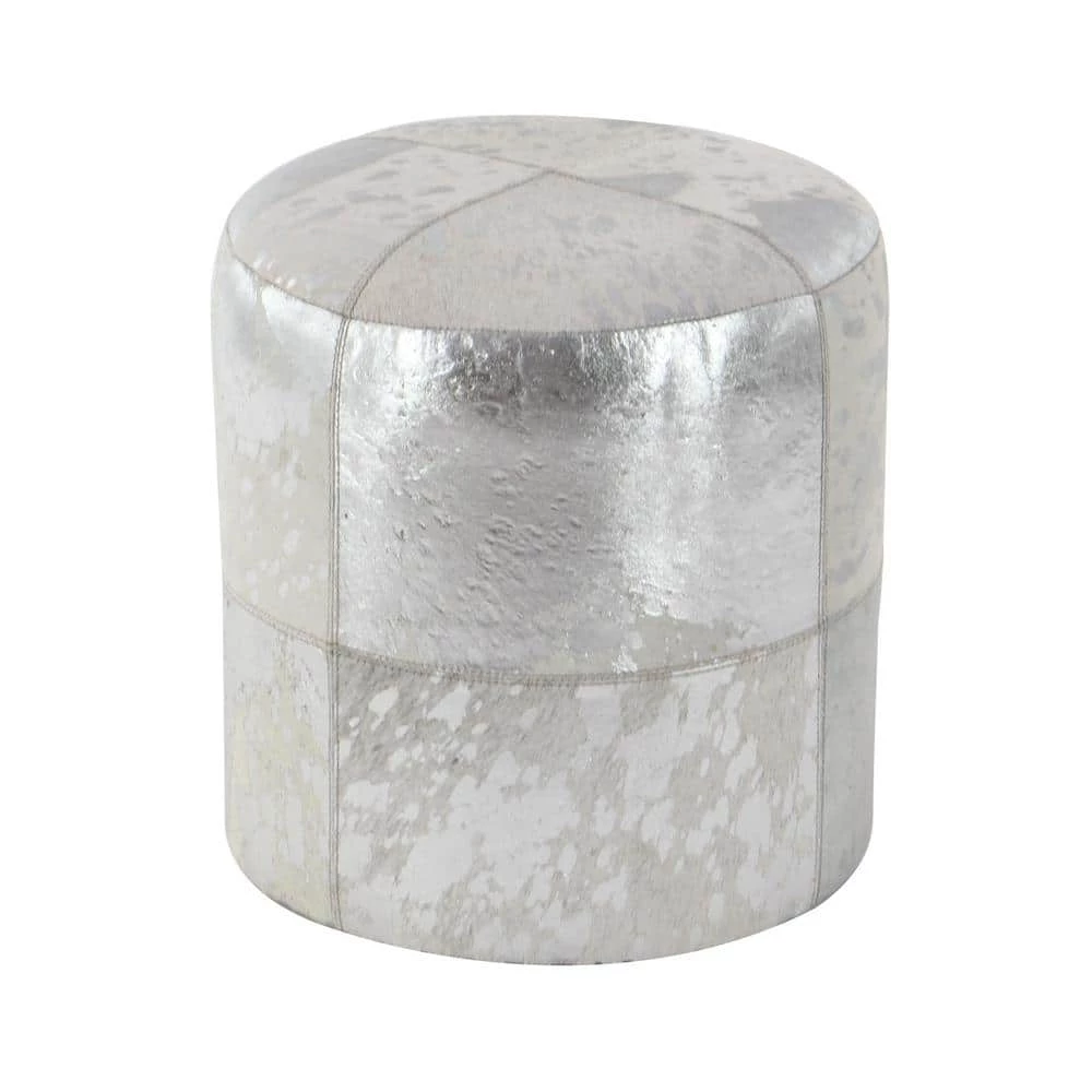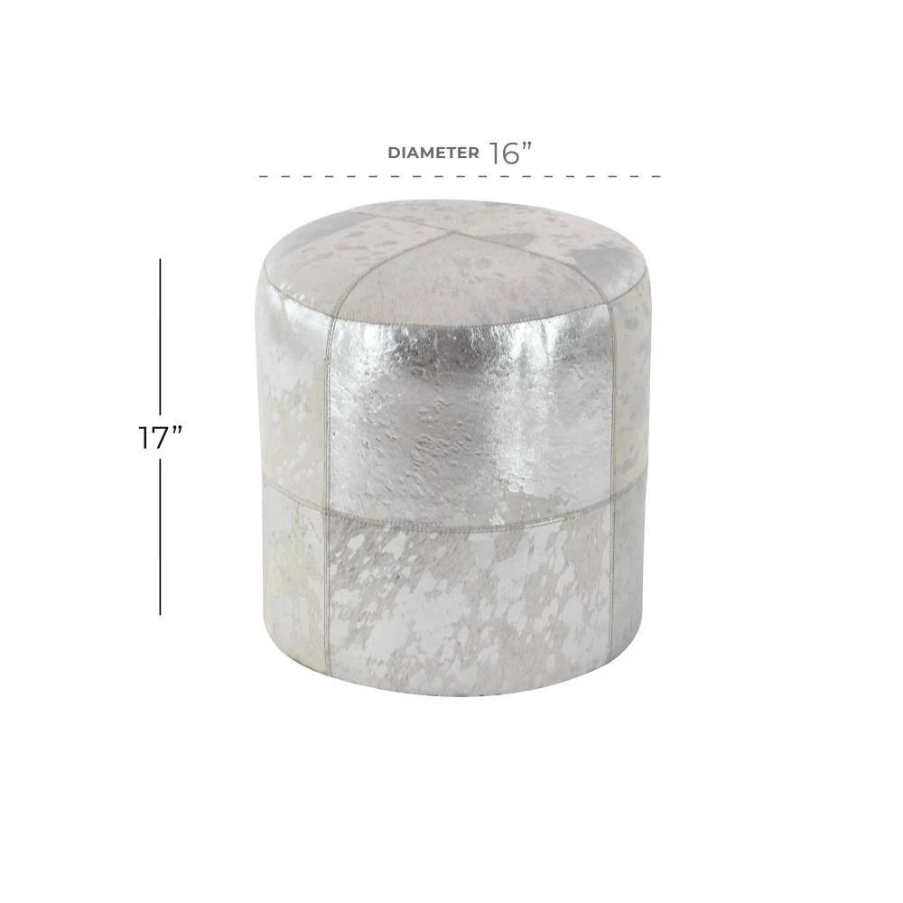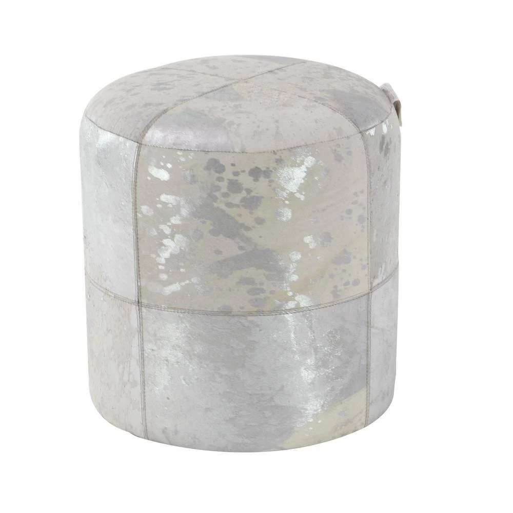 Give your living room a pop of shimmer with this ottoman as coffee table or end seat. This item ships in 1 carton. Due to the handmade nature of this item, no two will be alike, there will be slight differences in shape, size, and color. Suitable for indoor use only. Leather and hair on hide are natural products, and therefore no two will be alike. There may slight variations in pattern, natural blemishes, colors, and overall aesthetic of the product. Maximum weight limit is 200 lbs.. Made in India. This stool sits 1 person. Contemporary style.