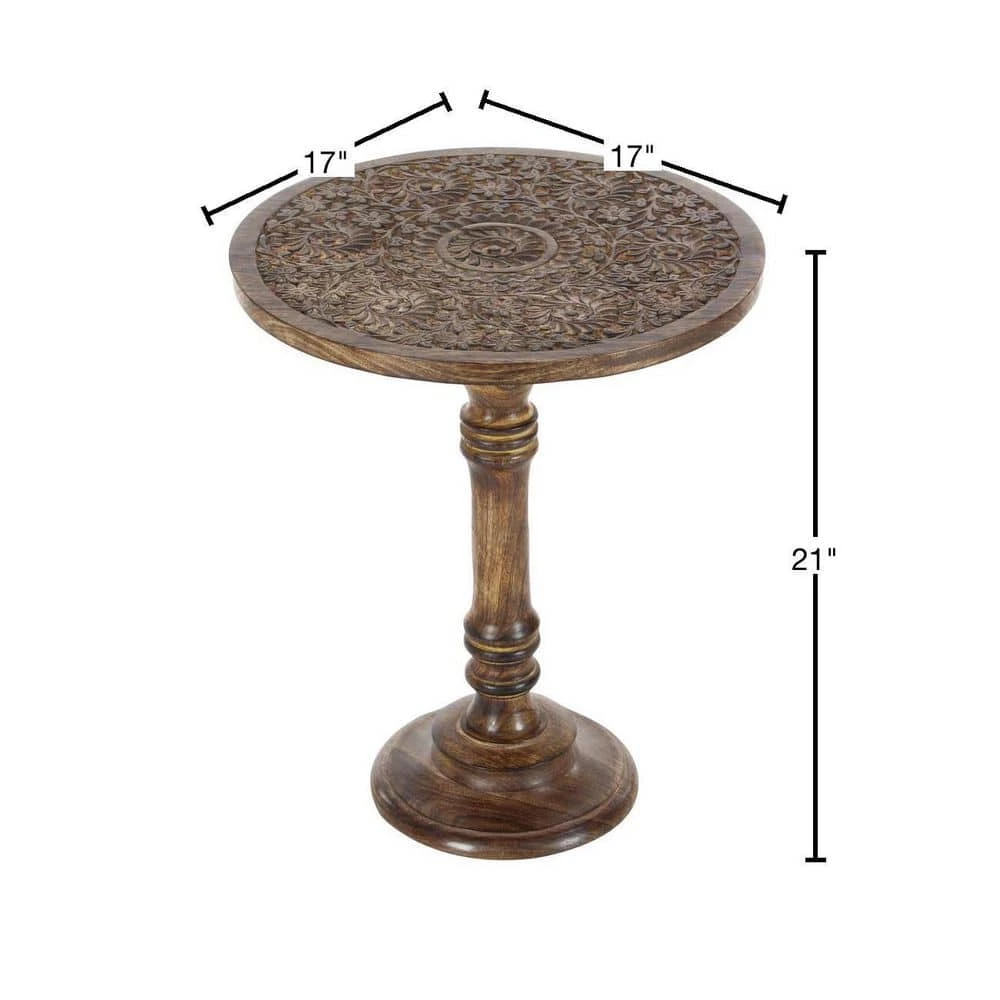 Bring a finishing touch to your home with an inviting appeal with this beautifully crafted accent table. A compact friendly table providing you with additional surface storage space any where in your home. Traditional carved end table are best displayed near upholstered sofa or wood beds with books and potted plants for a rustic look. This item ships in 1 carton. Due to the handmade nature of this item, no two will be alike, there will be slight differences in shape, size, and color. Suitable for indoor use only. Some assembly required. 100 lbs. weight limit. Made in India. Traditional style.