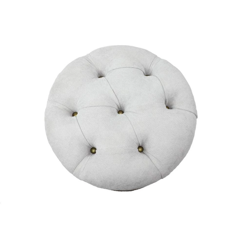 - Ottoman stool features dark brown base with wavy wood graining pattern and light gray tufted top with antique gold hardware