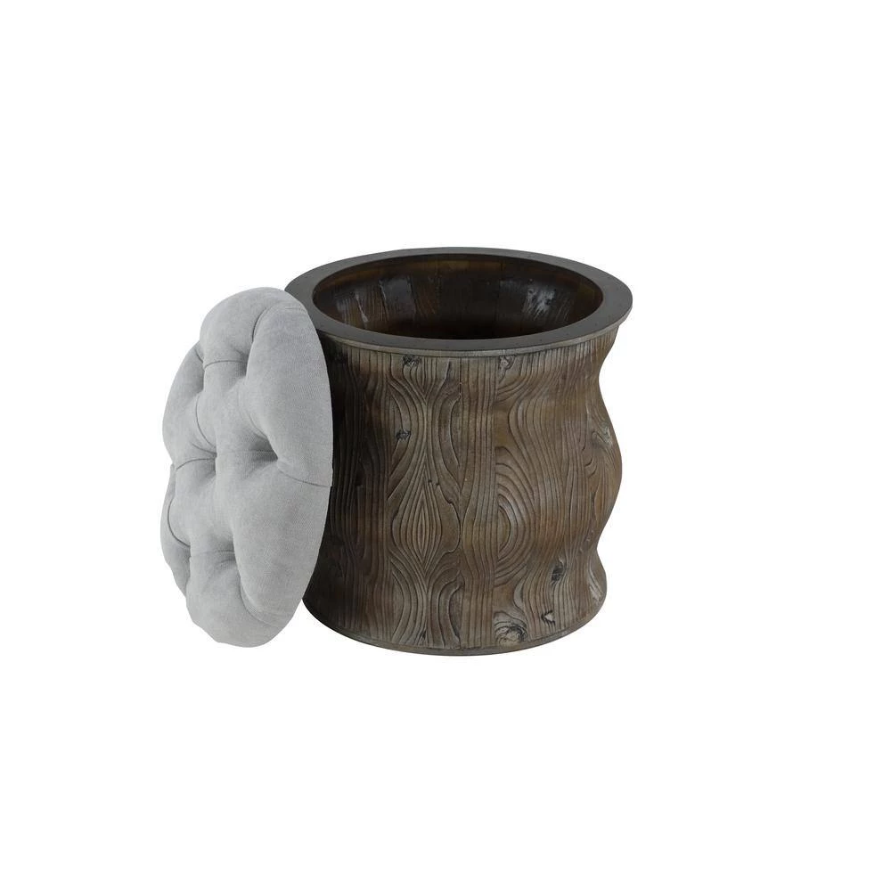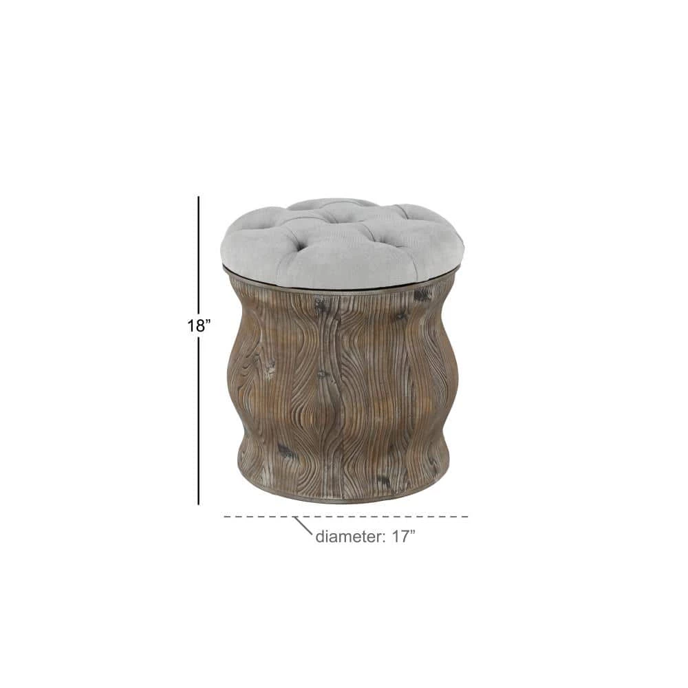 - Rustic foot stool features unique wavy wood pattern on its hourglass shaped body, a tufted linen top with brass knob hardware and lifts opens for additional storage
