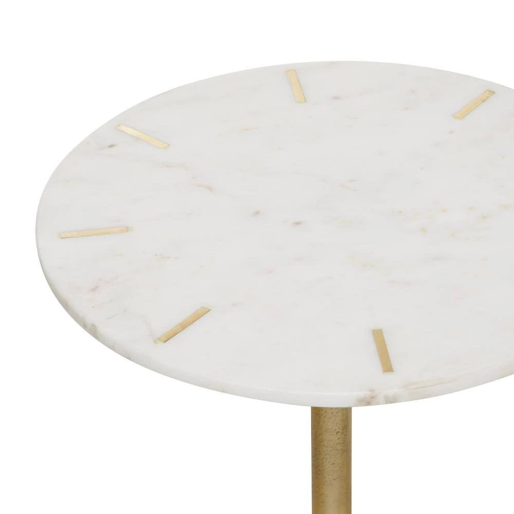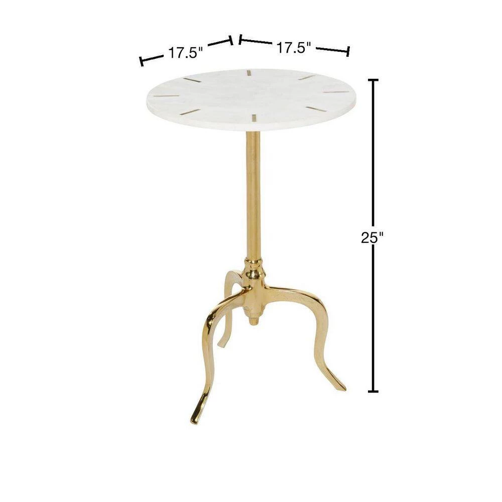 - Aluminum and marble accent table features polished gold legs and a white marble tabletop with gold linear accent