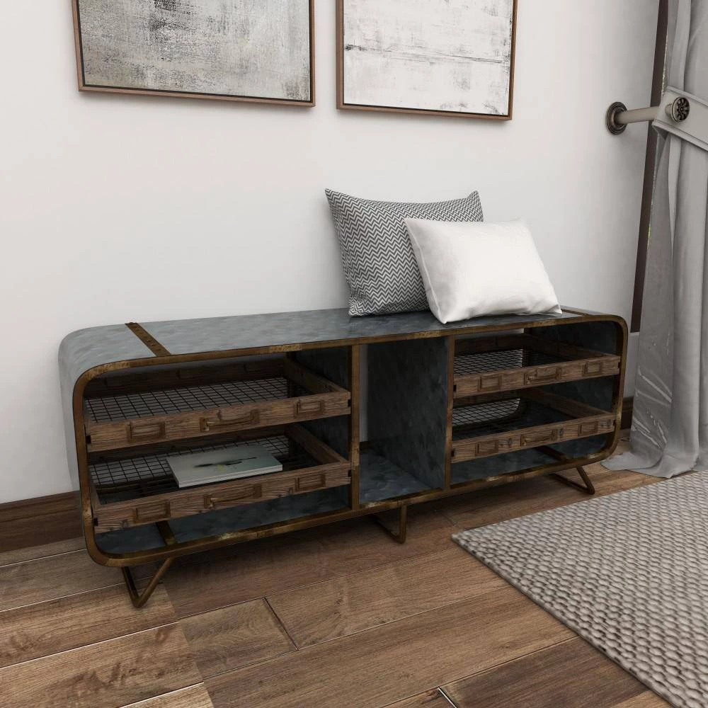 The size and shape of this small storage bench allow for an easy fit in any room of the house or office. This item comes with mounting hardware to prevent tipping. This item ships in 1 carton. 4 removable drawers. Suitable for indoor use only. 400 lbs. max weight limit. 4 open shelves with wire mesh and 1 with vertical orientation. Farmhouse style.
