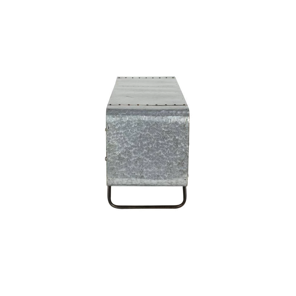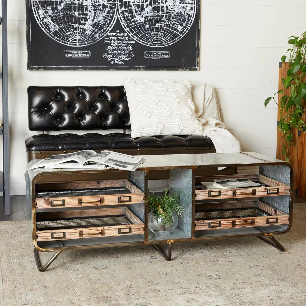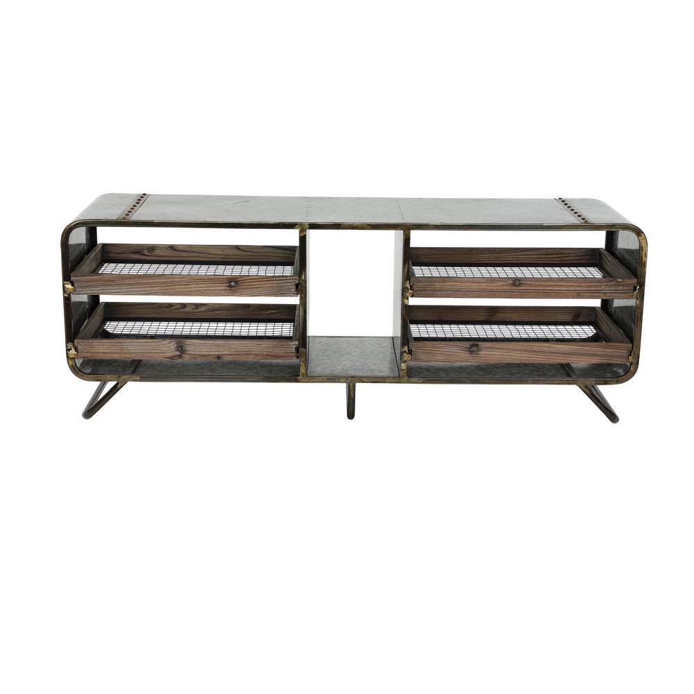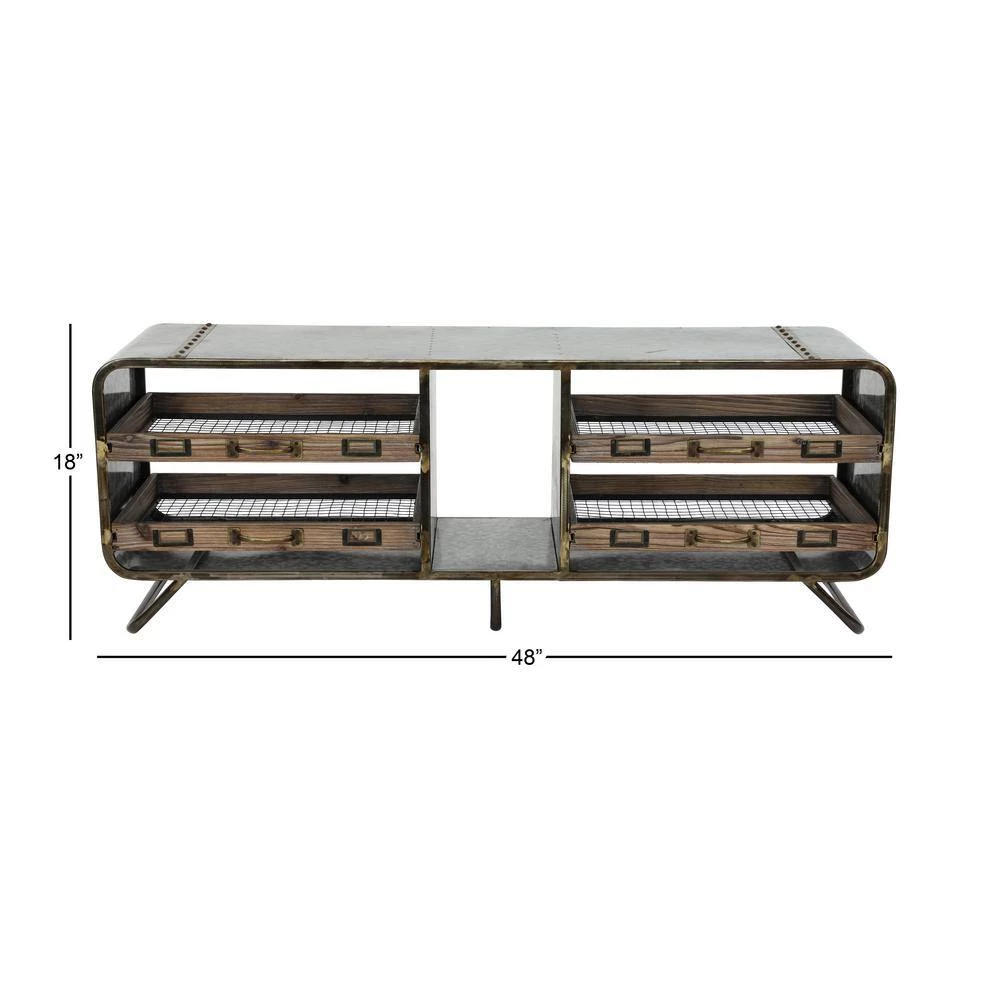 - Multi dimensional galvanized metal body wrapping around rustic light beige and mocha-colored drawers