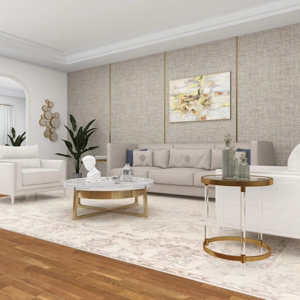 - Round metal accent table has a clear and gold color palette for a refined aesthetic