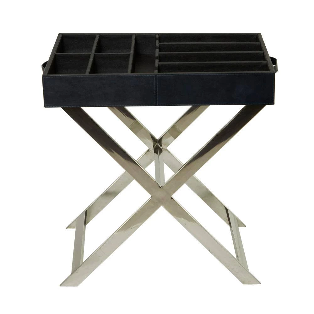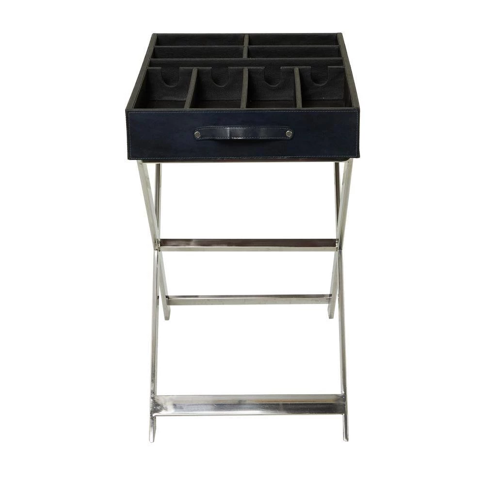 - Functional table inspired wine storage is furnished with a black leather exterior and a silver stainless steel stand