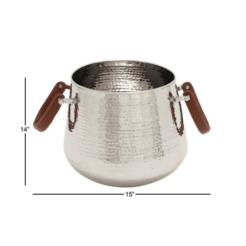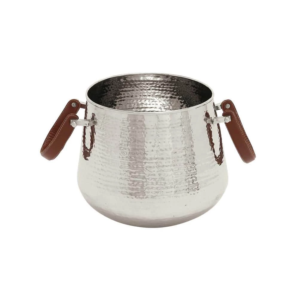 - Features round bowl shaped metallic silver finished wine cooler with a hammered design brown leather handles