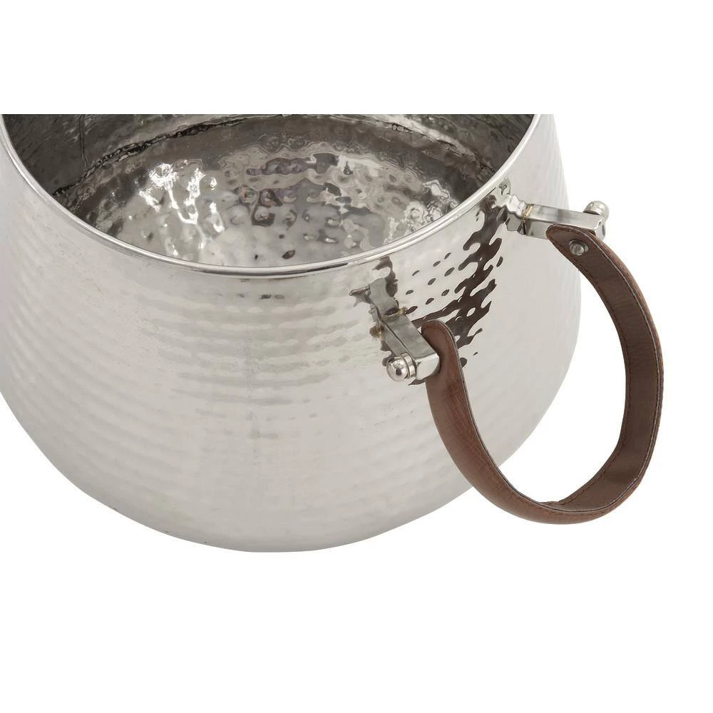 Enjoy your chilled wine, champagne, or beer in style with this modern hammered stainless steel ice bucket with handles. Display your wine bottles with style and make everyone thirsty with envy. Looks stylish in your living room or kitchen as a way to display and serve your favorite wines. Designed with black rubber stoppers at the base that prevent scratching furniture and table tops, as well as sliding around. This item comes shipped in one carton. Features authentic leather handles. Suitable for indoor use only. Made in India. Modern design.