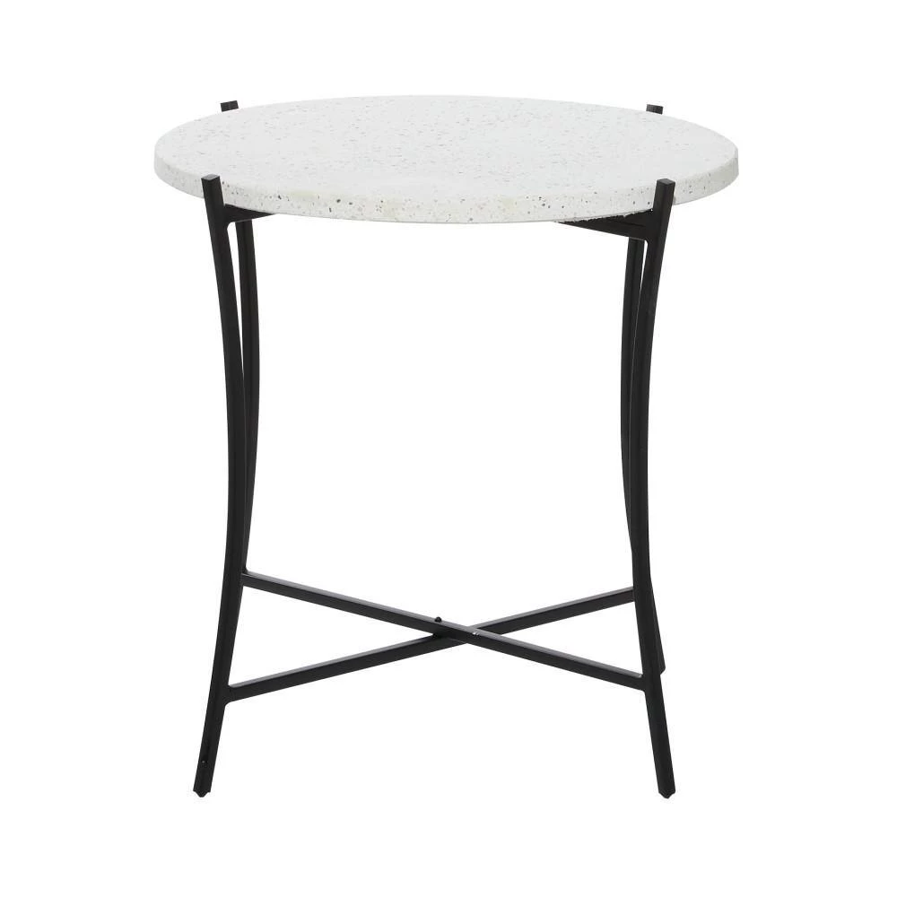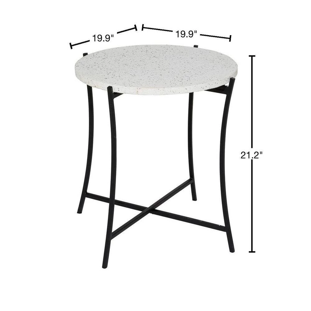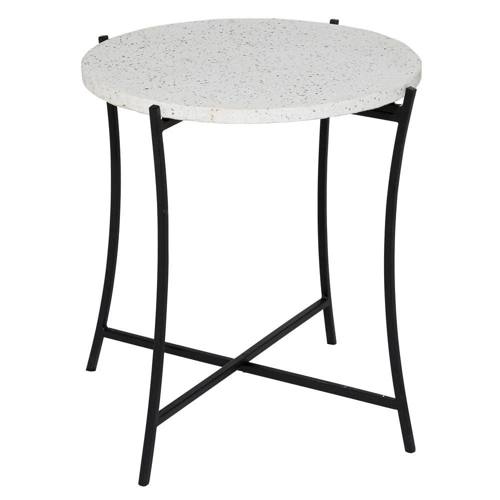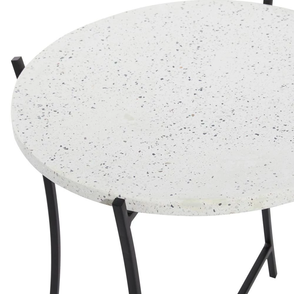 - Round side table features a chic black and white color palette, terrazzo table top with gray speckling