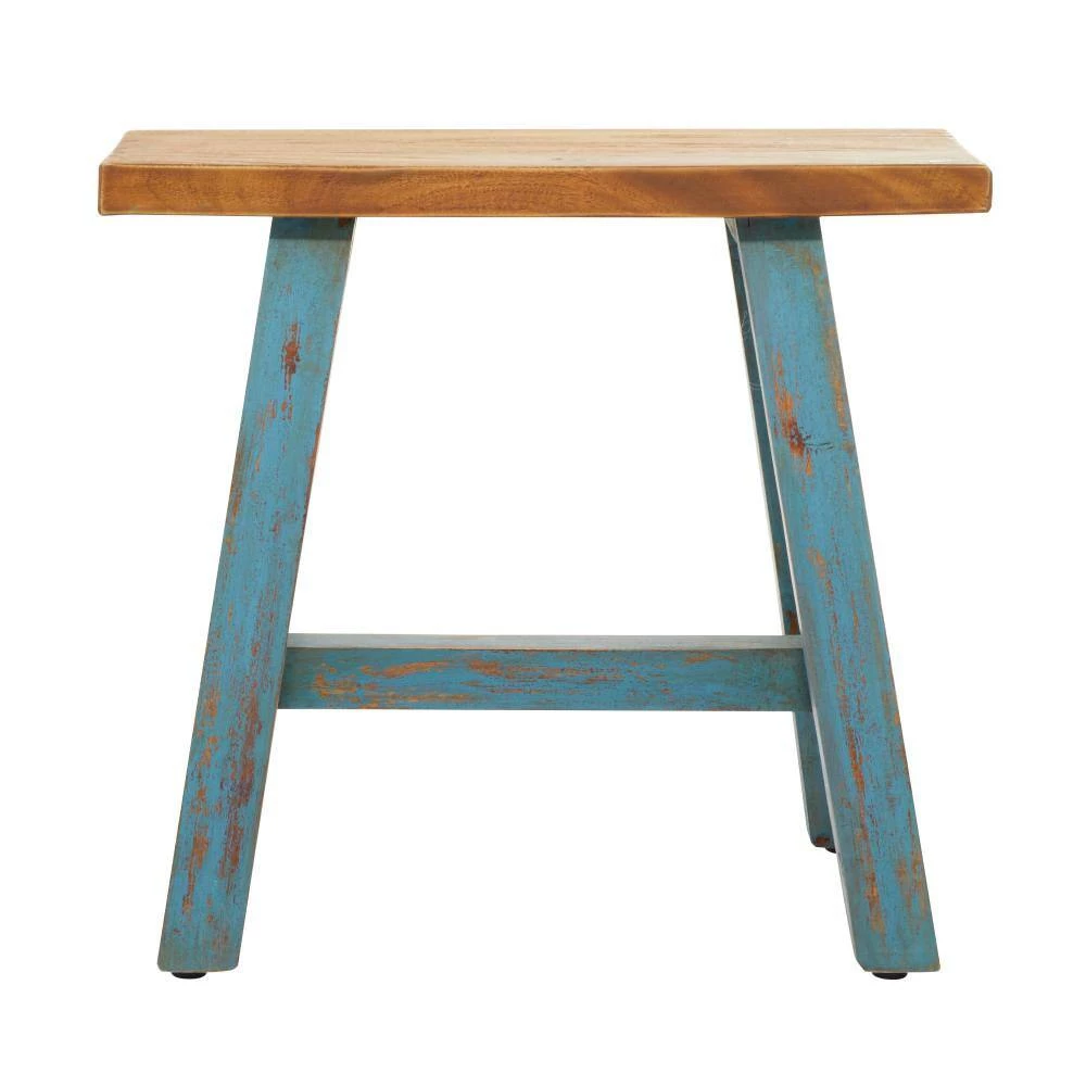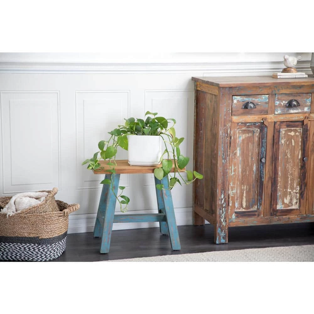- Features a natural brown wooden finish and a distressed teal finish