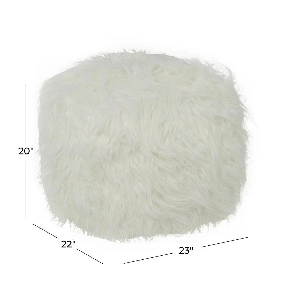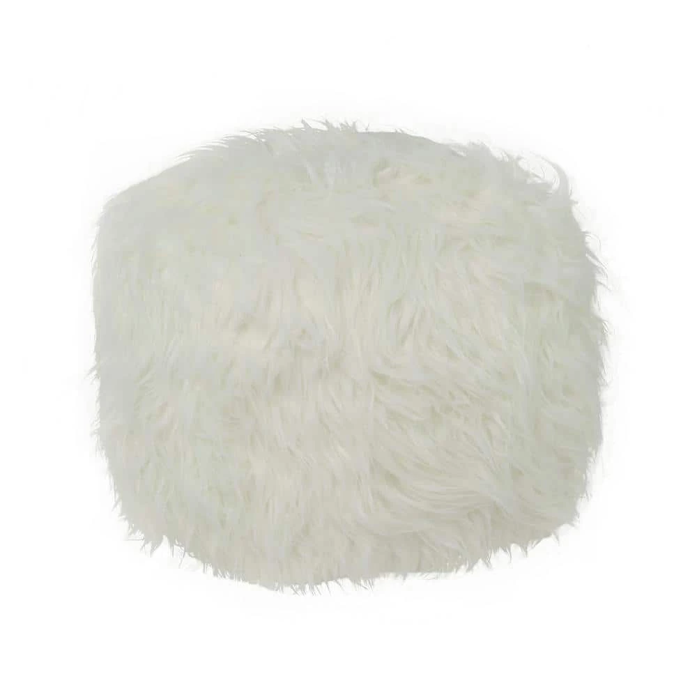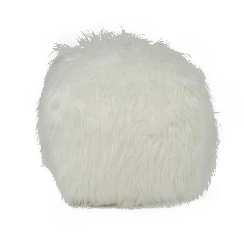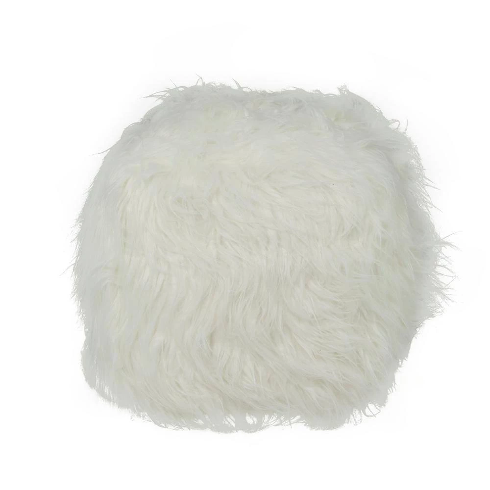 - This white faux fur stool showcases a cube-inspired cushioned stool with a long hairy faux fur body exterior