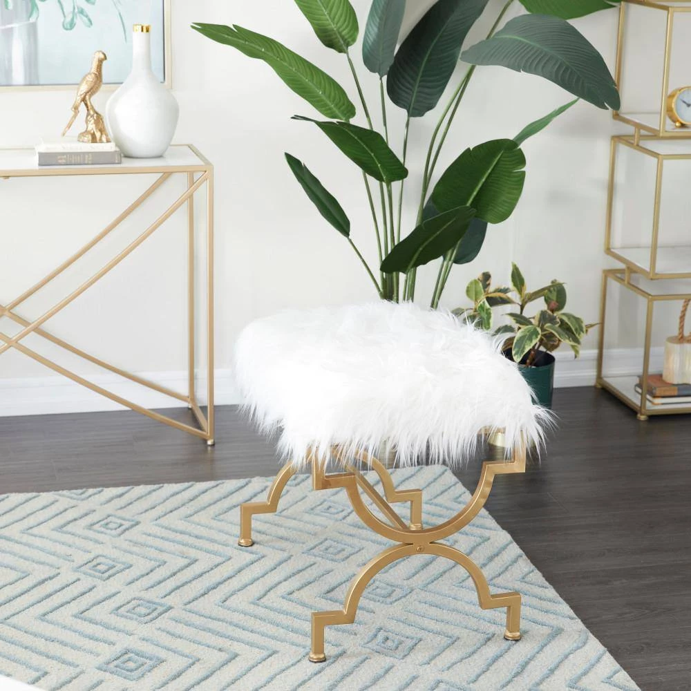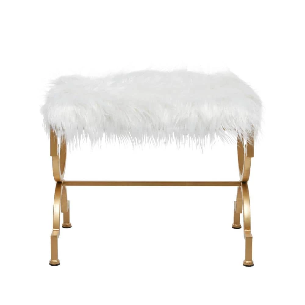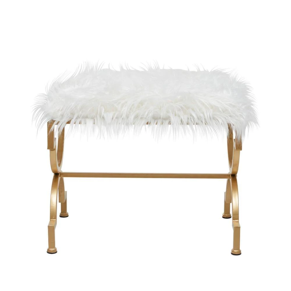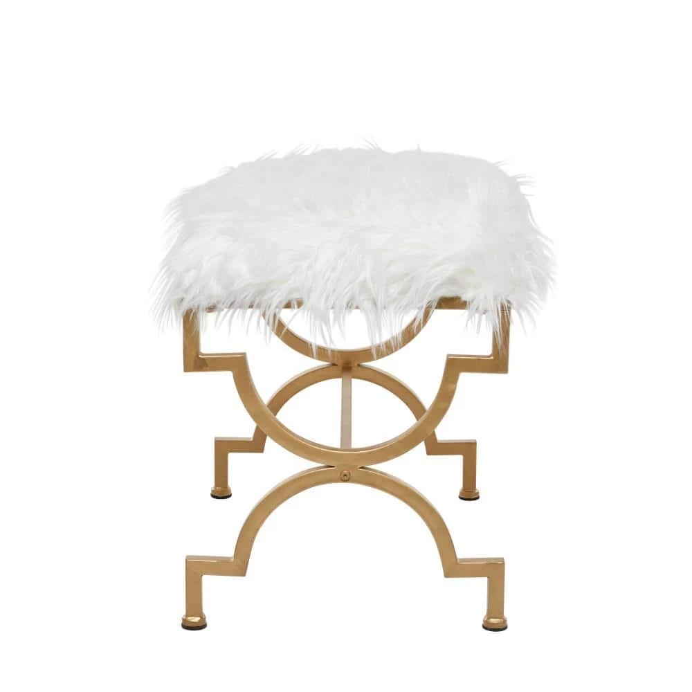 - Accent bench highlights a metallic gold frame with cotton white faux fur seat cushion