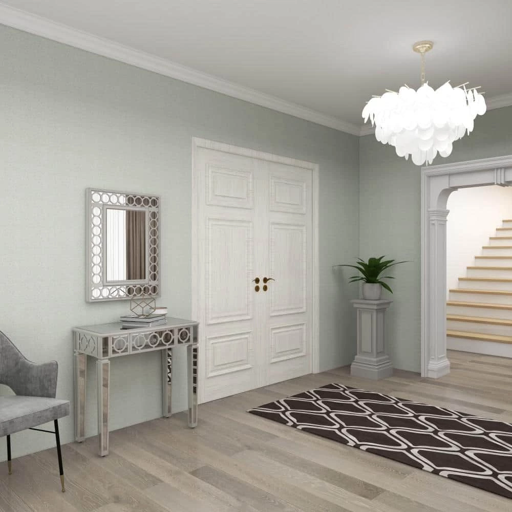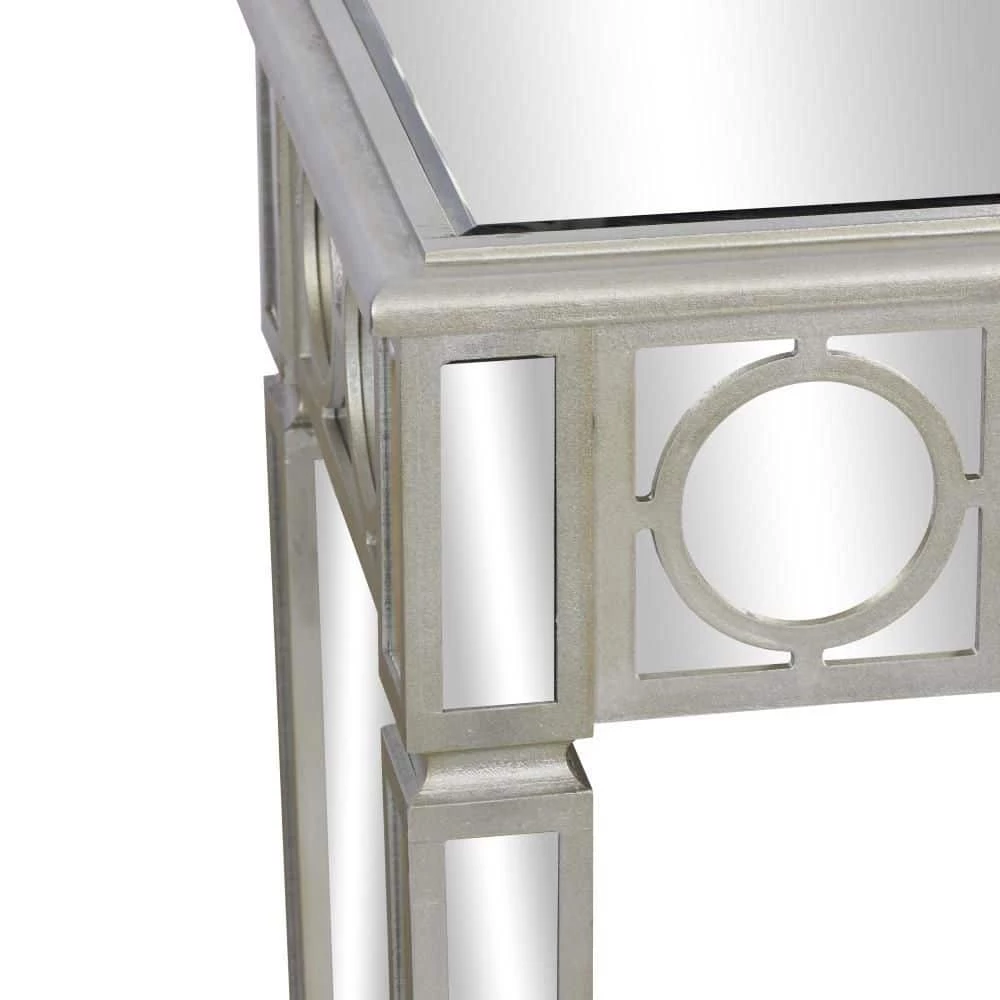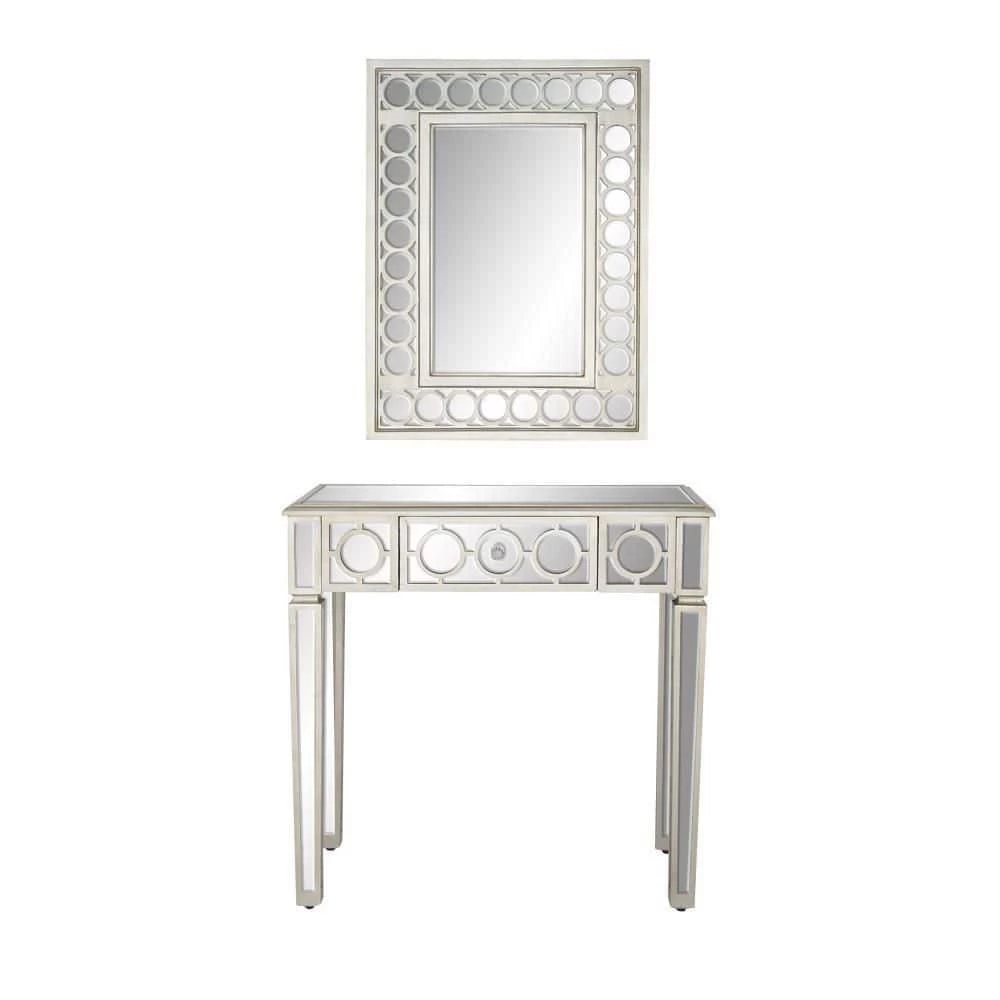 - Console table and mirror set carries clear reflective mirror panels with silver metallic frames