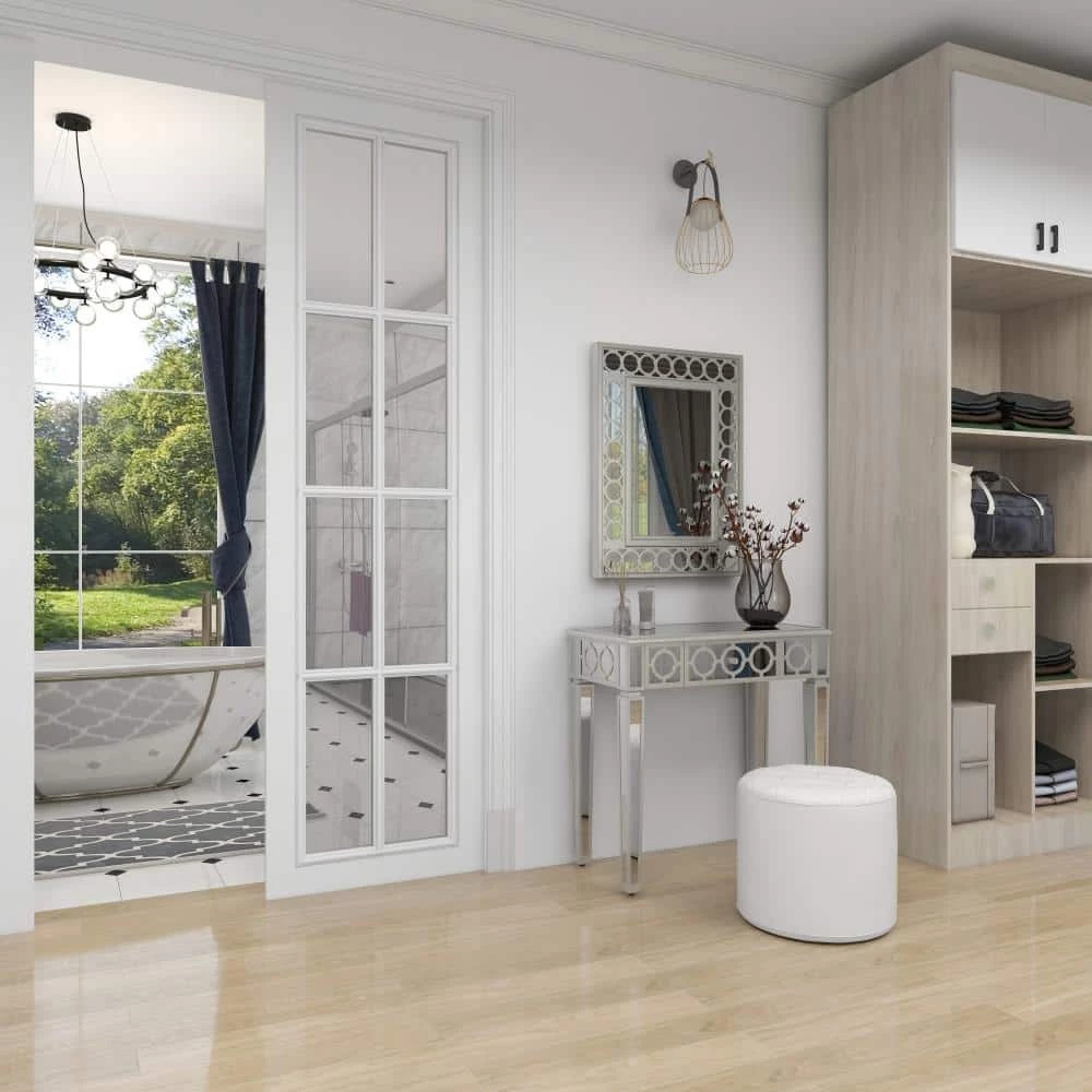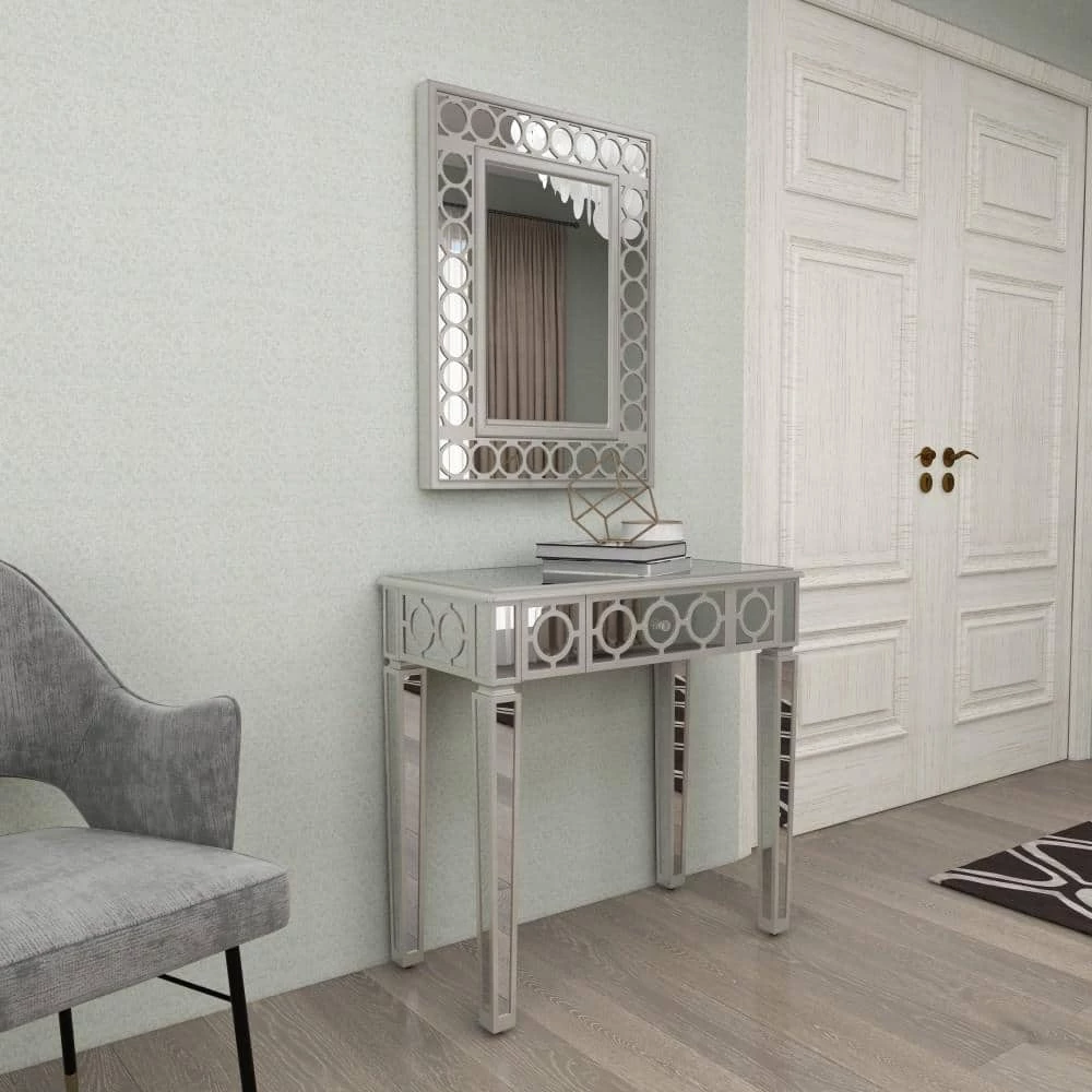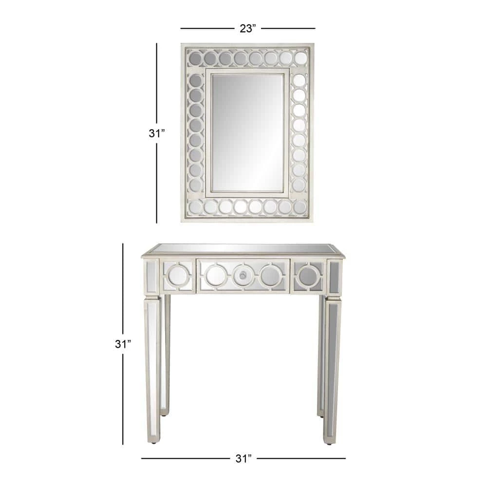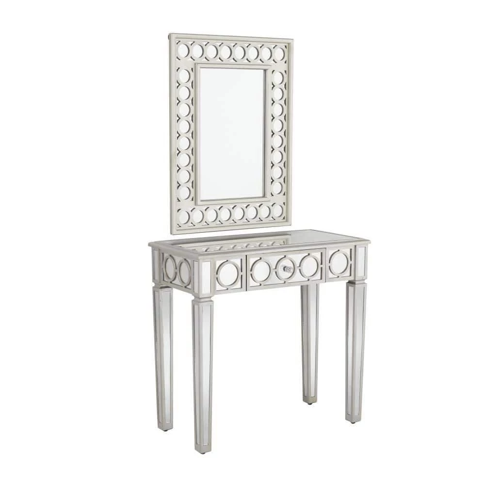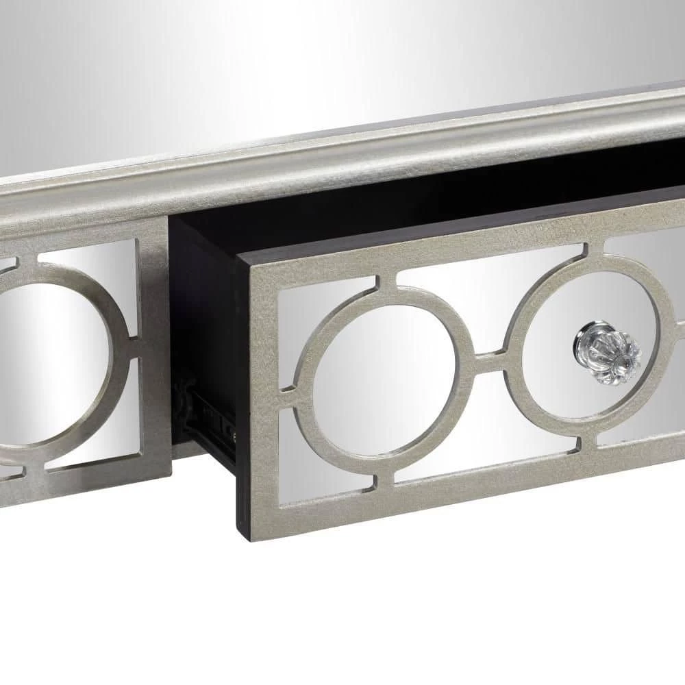 - Silver vanity table and mirror set features circular cut out overlay the mirror paneling structure with one drawer for additional storage space
