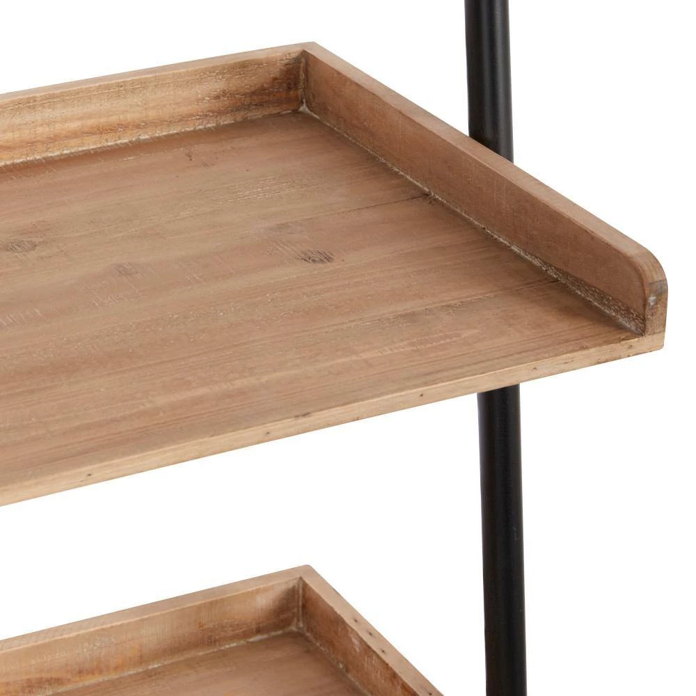 - Ladder shelving unit carries light brown shelves with black metal frame