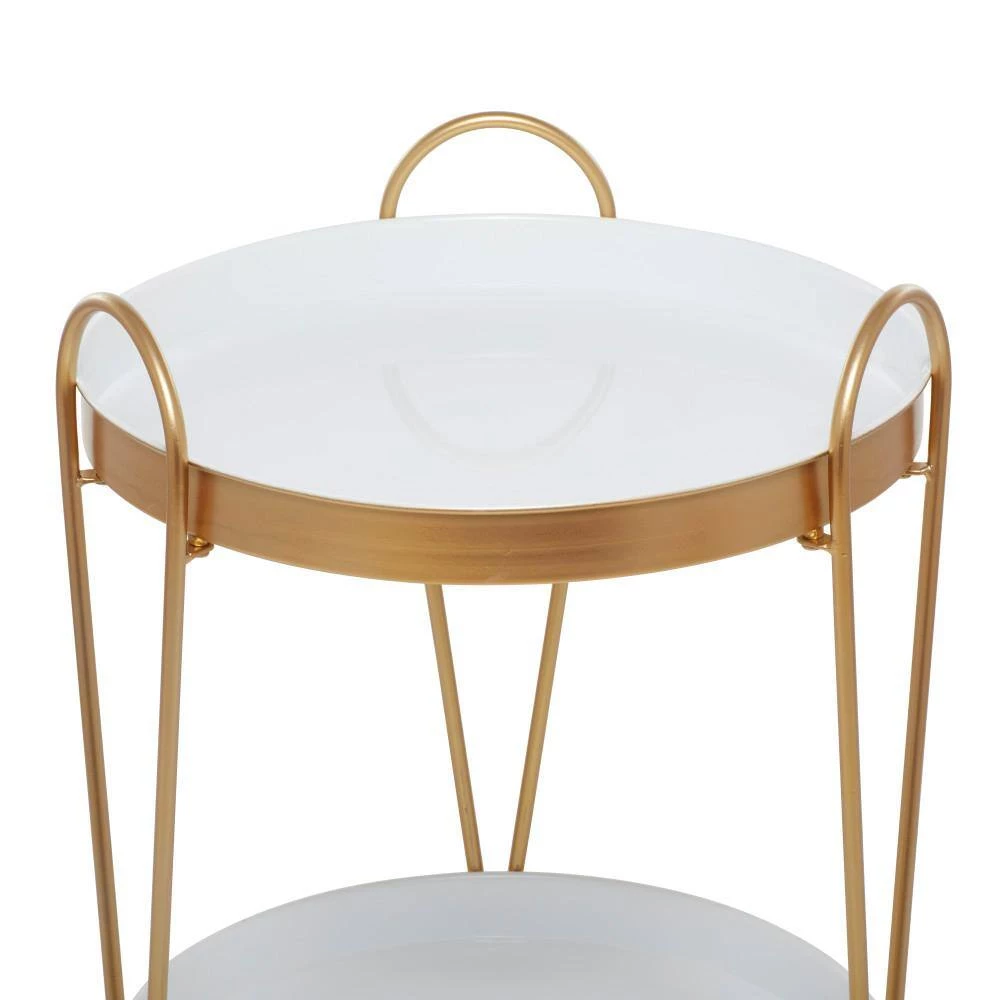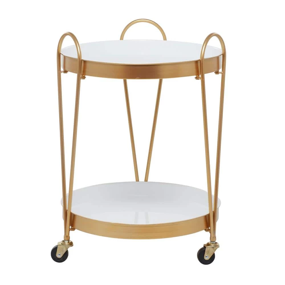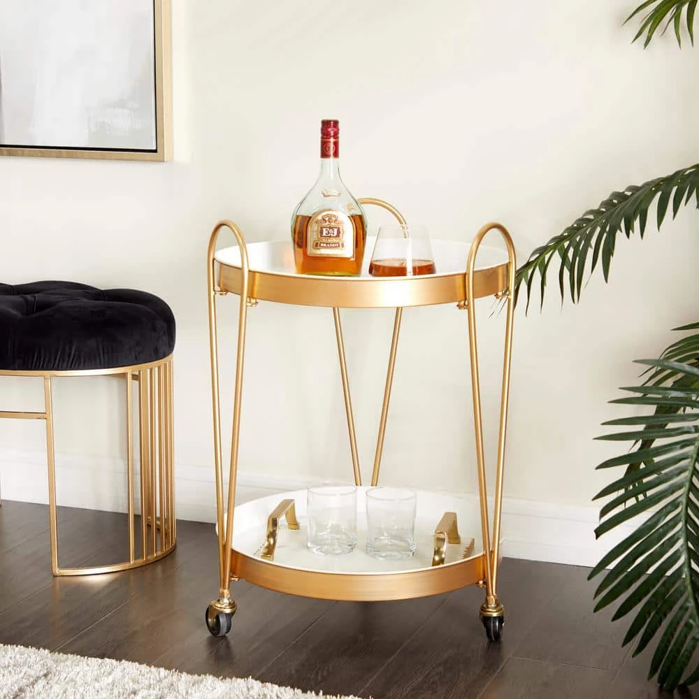 - Bar cart highlights a dark metallic gold finish with daisy white shelf interior accent finish