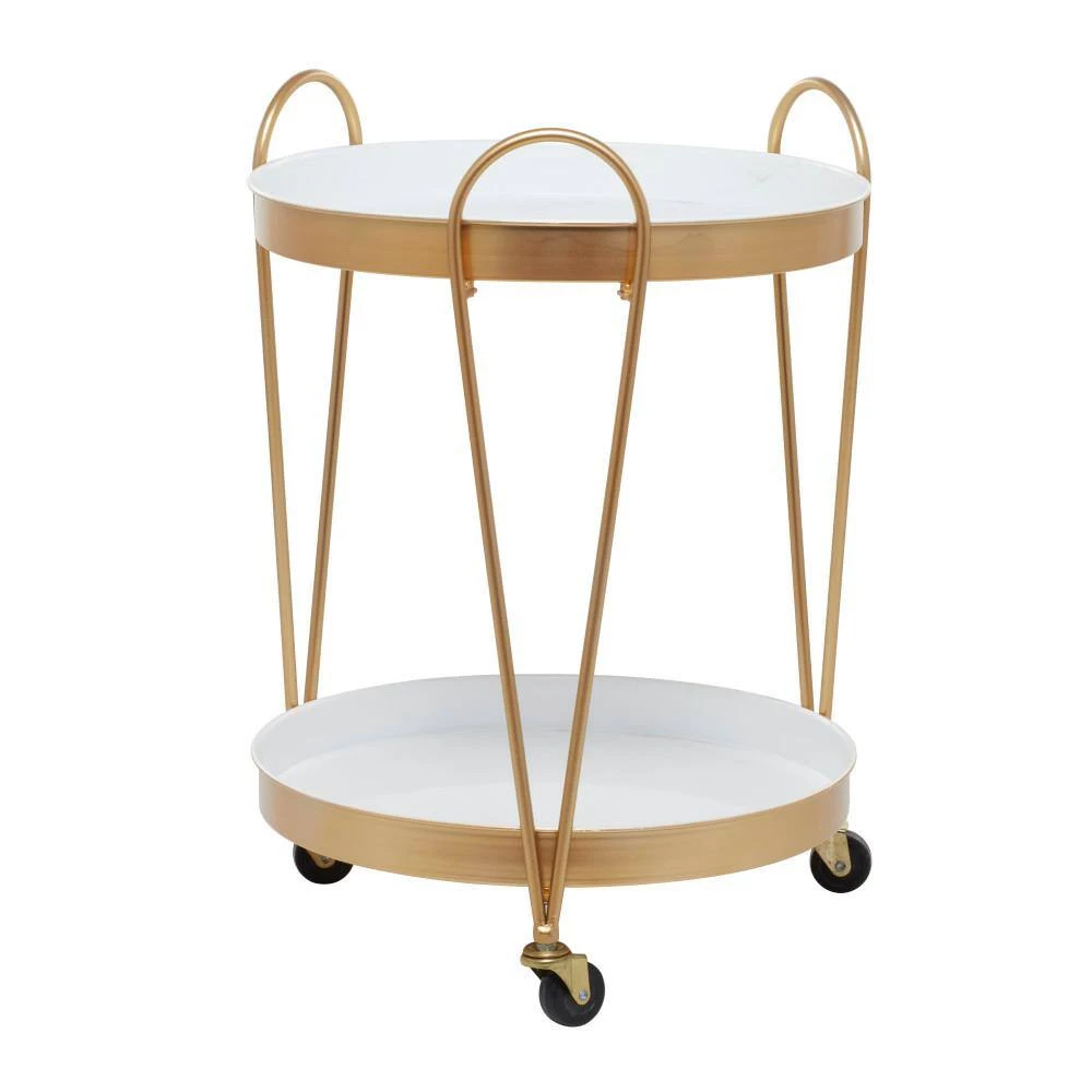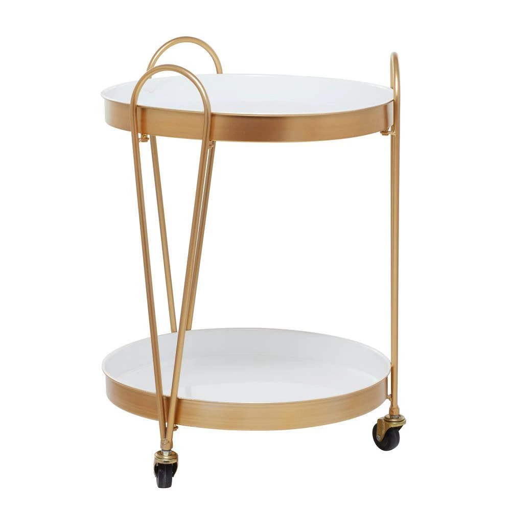 - Gracefully sporting 2 tiers, this golden bar shelf cart is easily transported with its hairpin legs attached to wheels as its convenient feature