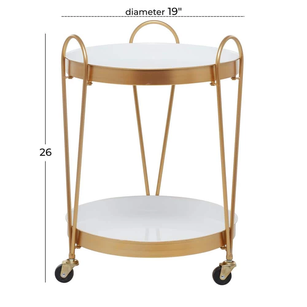 A versatile piece ideal for storage or decorative display in any space. Looks stylish in your living room or kitchen as a serving tray or as a decor stand. Get organizing in a posh and sophisticated style with this gold bar cart placed in any of your home spaces. This item ships in 1 carton. Suitable for indoor use only. Maximum weight limit is 30 lbs. Each round shelf has 18.80″ depth and width. Contemporary design. Item doesn’t have a wine bottle slot.