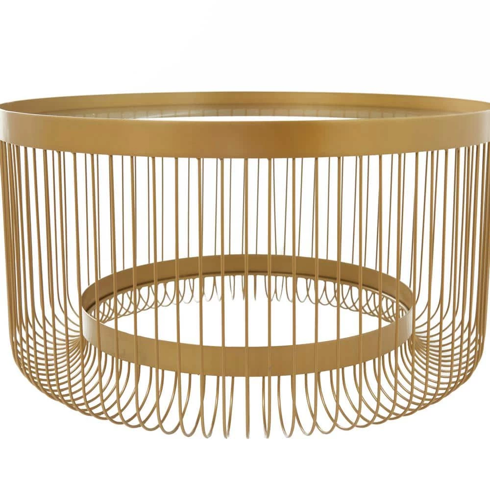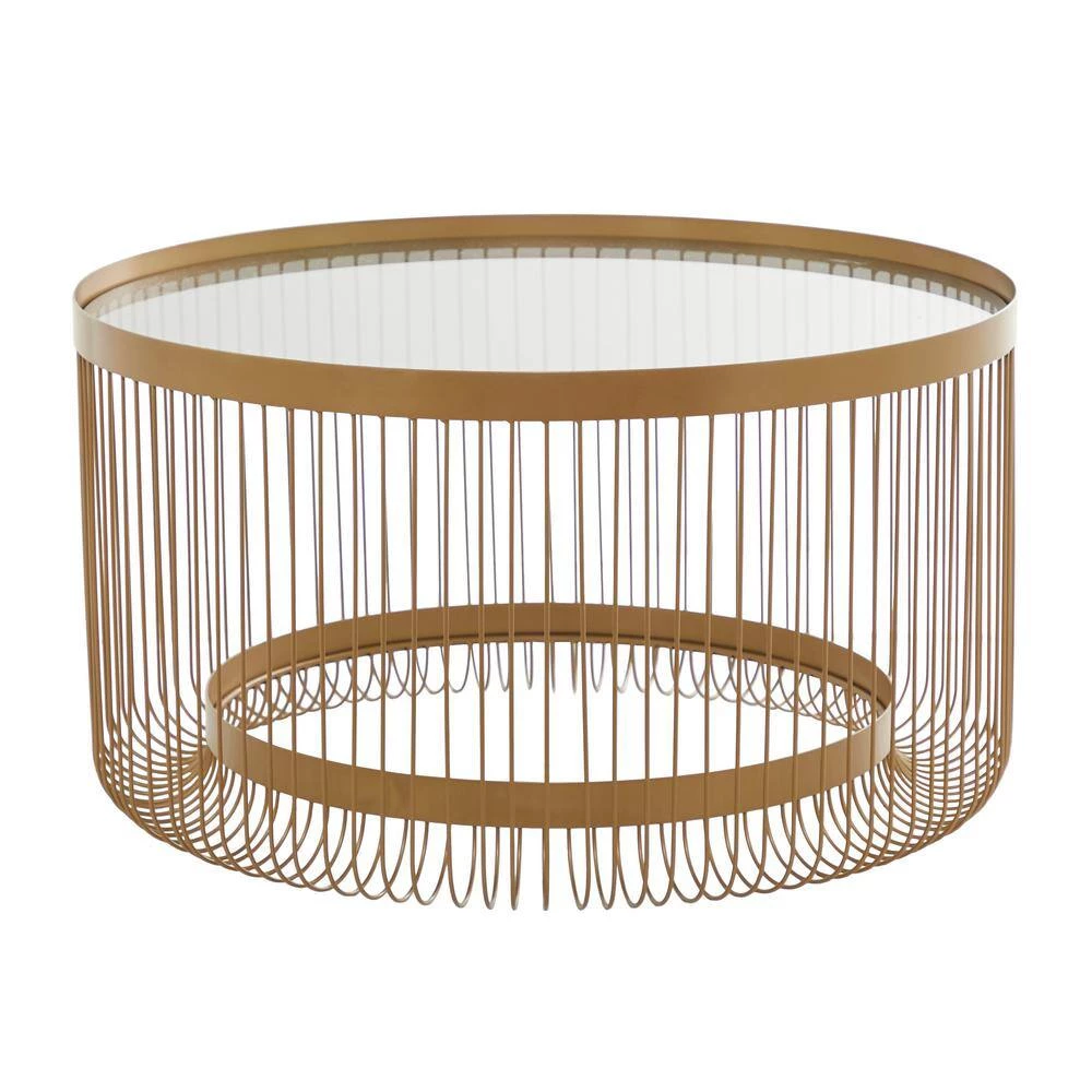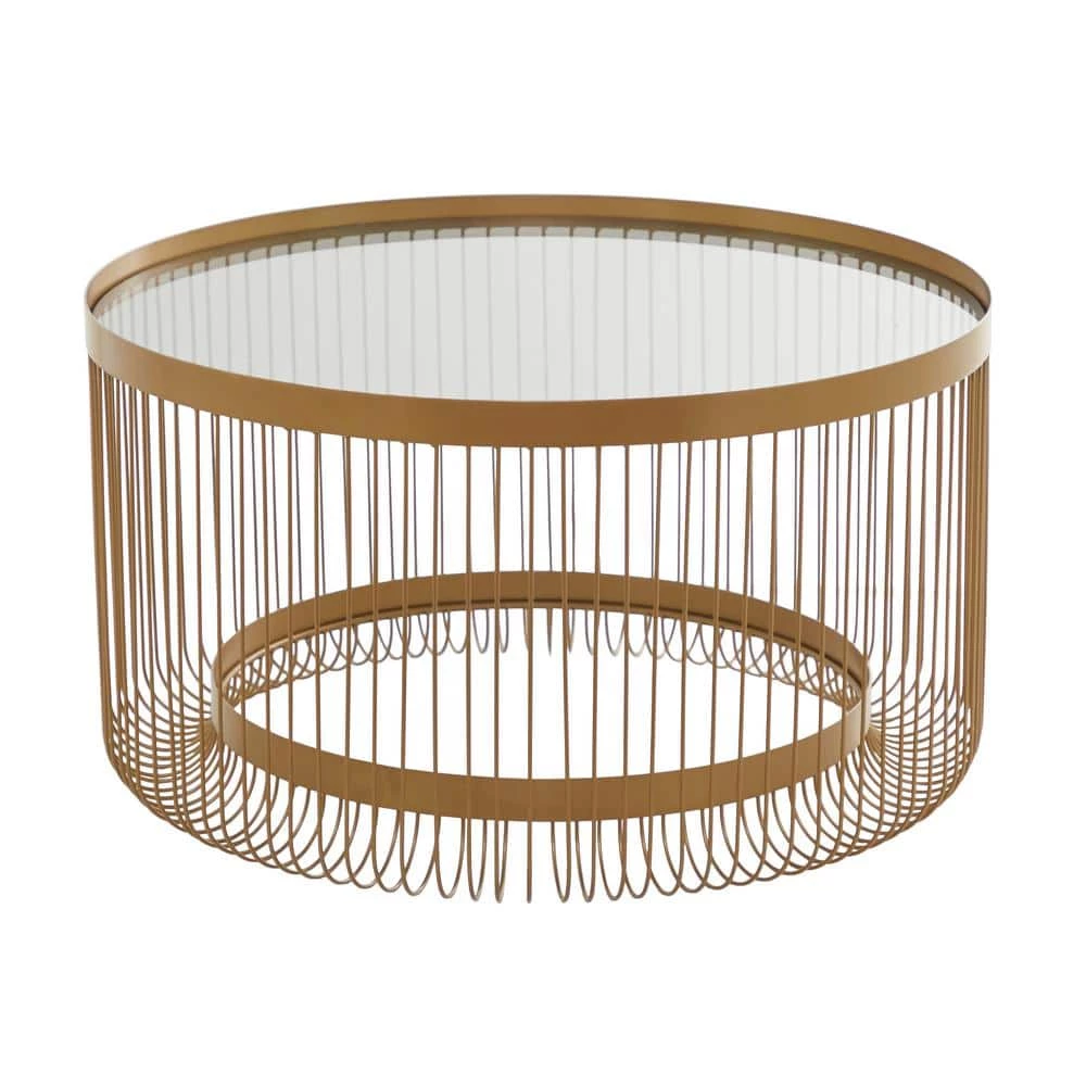 - This coffee table showcases a large transparent round glass top securely mounted on gold metal frame designed with wire body with an open center base that can be used to display a planter or sculpture