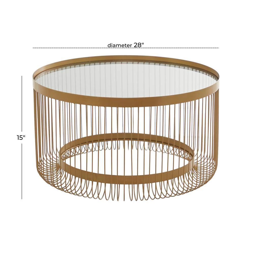 - This metal and glass coffee table highlights a round table top and body with wire style design