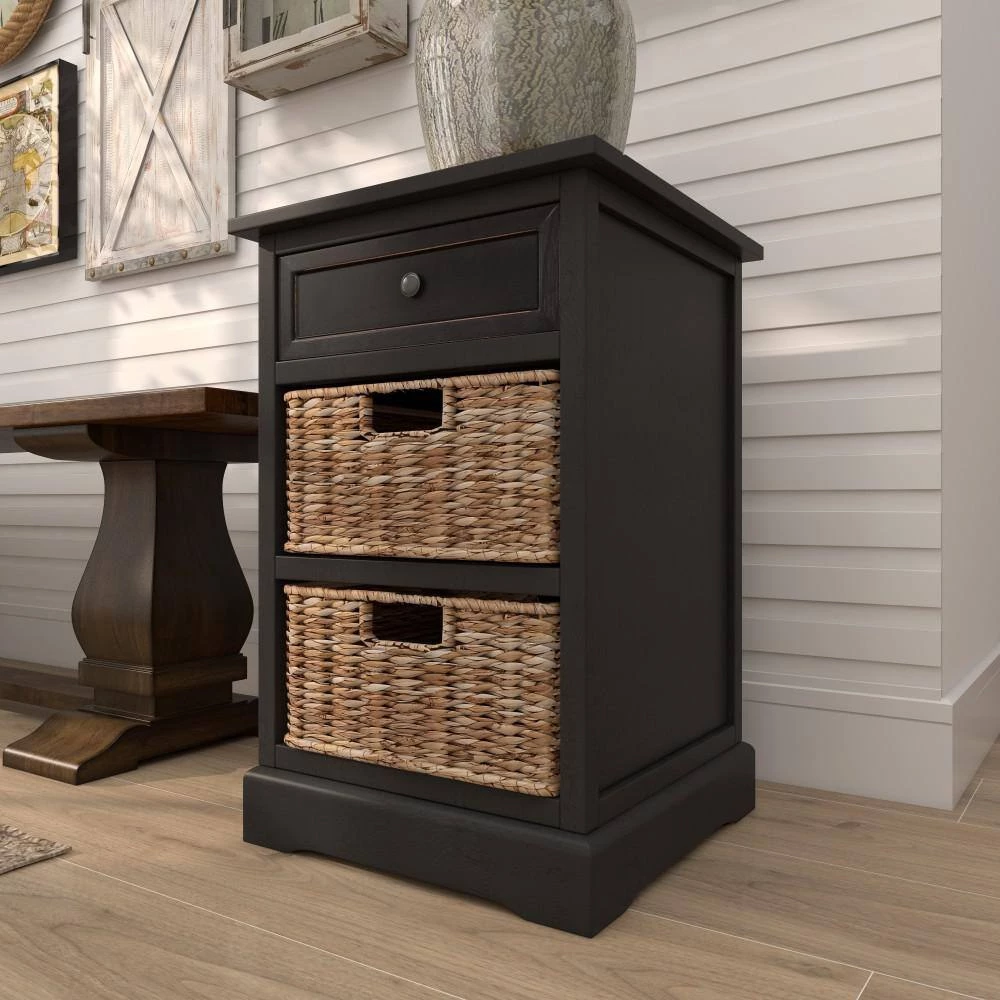 - Wood accent table with drawer carries a matte black finished with light brown wicker baskets