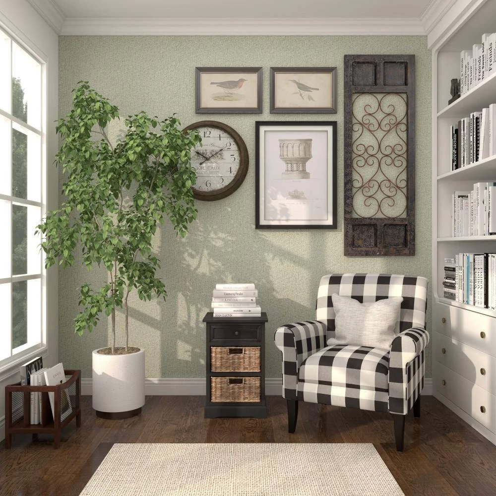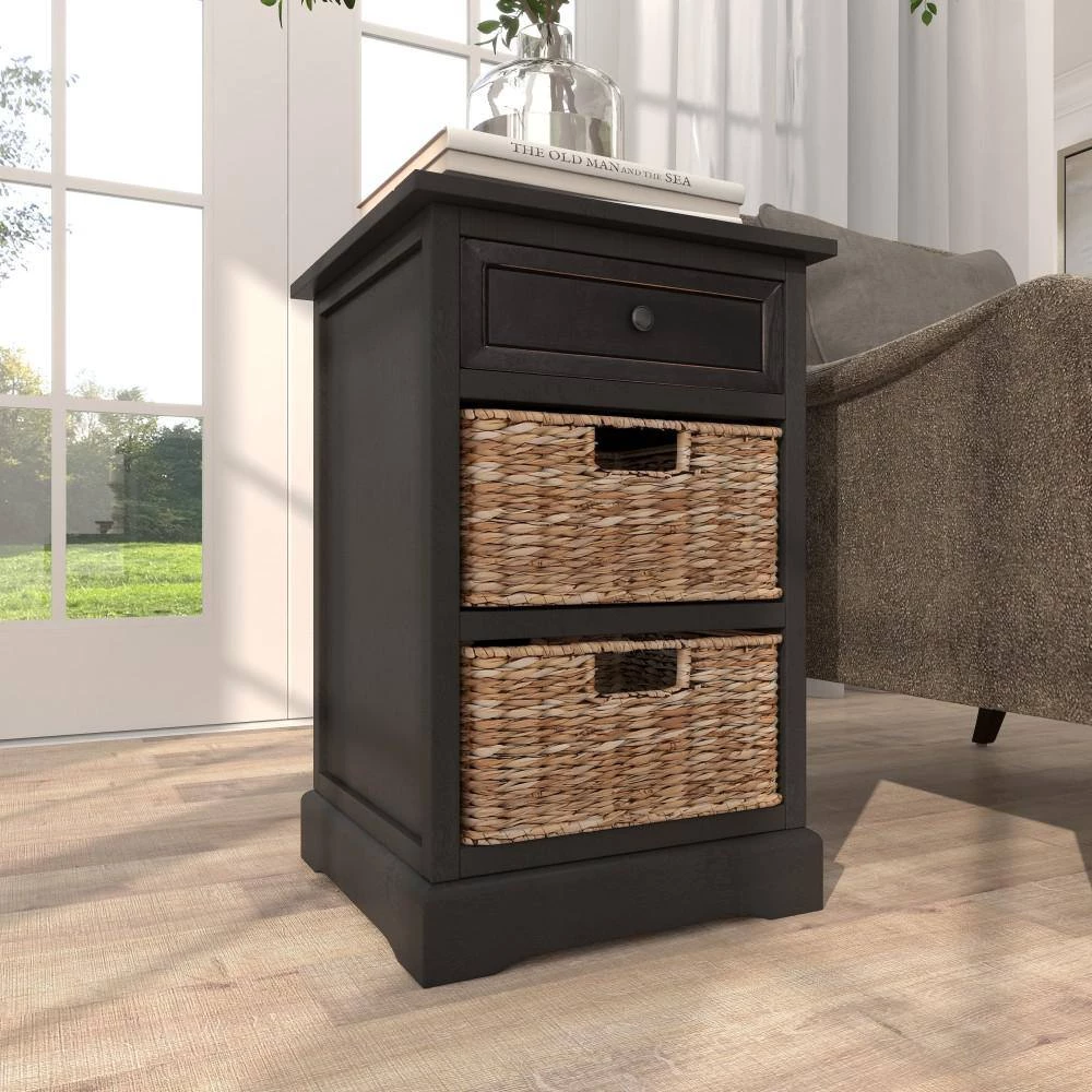 - Traditional black end table is furnished with a single pull-out drawer and 2 removable wicker baskets for convenient storage