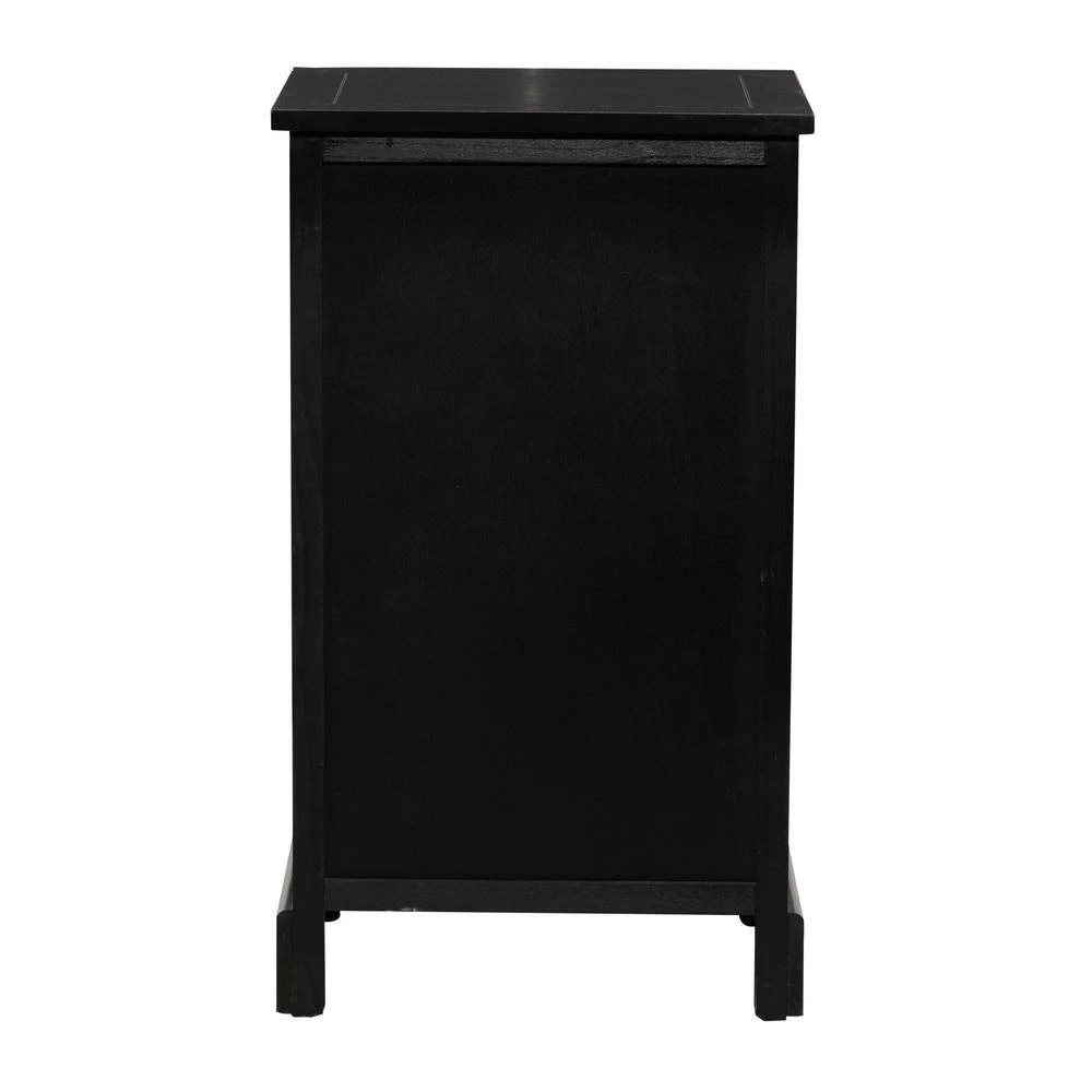 - Black side table with drawers is made of red pine wood, fiberboard and woven banana leaves baskets