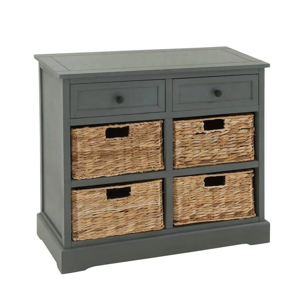 Arrange this accent cabinet in your entryway, lobby, living room, reading room, or home office. It is ideal to display small planters or ornaments on top to complete its country look. Organizing isn’t boring when you have an amazing storage unit at your disposal. Filled with shoes, books, blankets and more, these storage units are a stylish and convenient way to store your belongings. Includes 2 wooden drawers and 4 wicker baskets as pull-out drawers. Suitable for indoor use only. Maximum weight limit is 100 lbs., each drawer can hold up to 25 lbs. Traditional theme. This item comes with mounting hardware to prevent tipping.