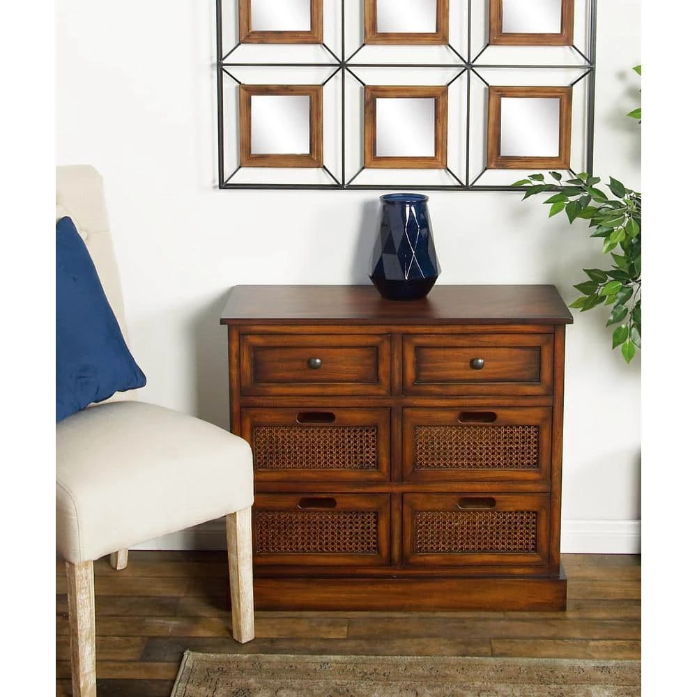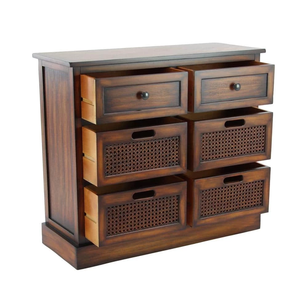 Create an rustic display with this storage unit and decorate it with large wooden vases on top of books under an oversized wall mirror. This item ships in 1 carton. Item features 6 rectangular-shaped wooden drawers with interior dimensions of 4.37″H x 12.5″L x 9.12″W and 7.25″H x 12.5″L x 8.82″W. Suitable for indoor use only. Item has maximum weight limit of 100 lbs.. Traditional style.
