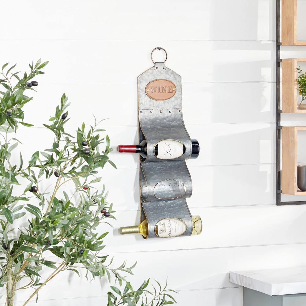 Display your wine bottles with this grey farmhouse 3-bottle metal wall wine holder. Made with galvanized metal, this wine bottle holder is made with 3 metal loops as bottle holders that is securely fixed to a wall mount. It features a faux leather lettered wine label and a single metal ring hanging hook. Placed on your dining or living room walls, this wine bottle holder is a rustic addition to your farmhouse-themed home. This item comes shipped in one carton. A loop hardware at the top section allows for easy hanging via a nail or screw. Suitable for indoor use only. This item can hold 3 wine bottles. The word “WINE” is stamped on the PU leather label. Farmhouse-themed style.