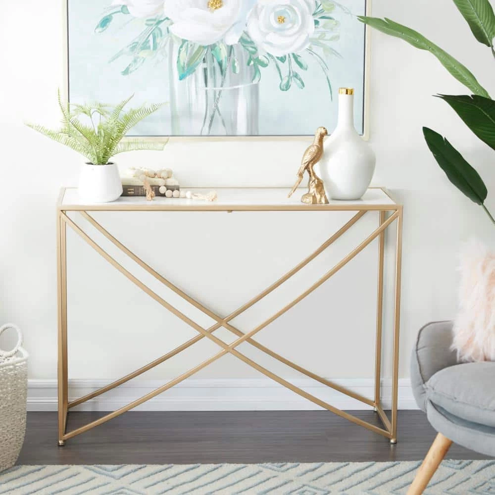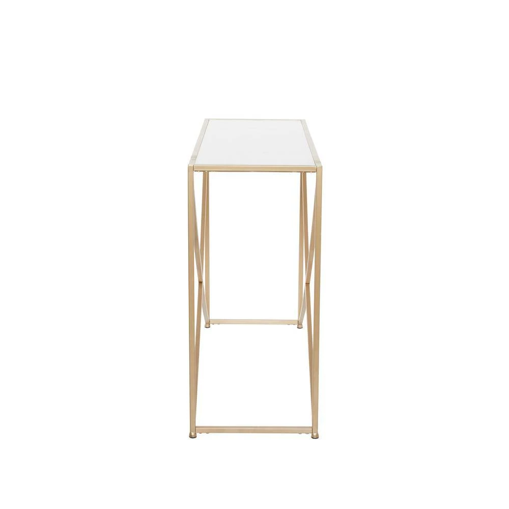 - This metal console table features a gold-finished body and legs designed with a white marble tabletop