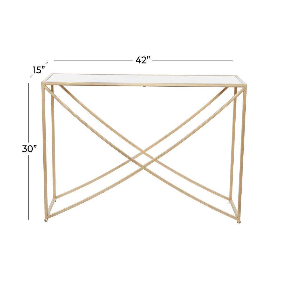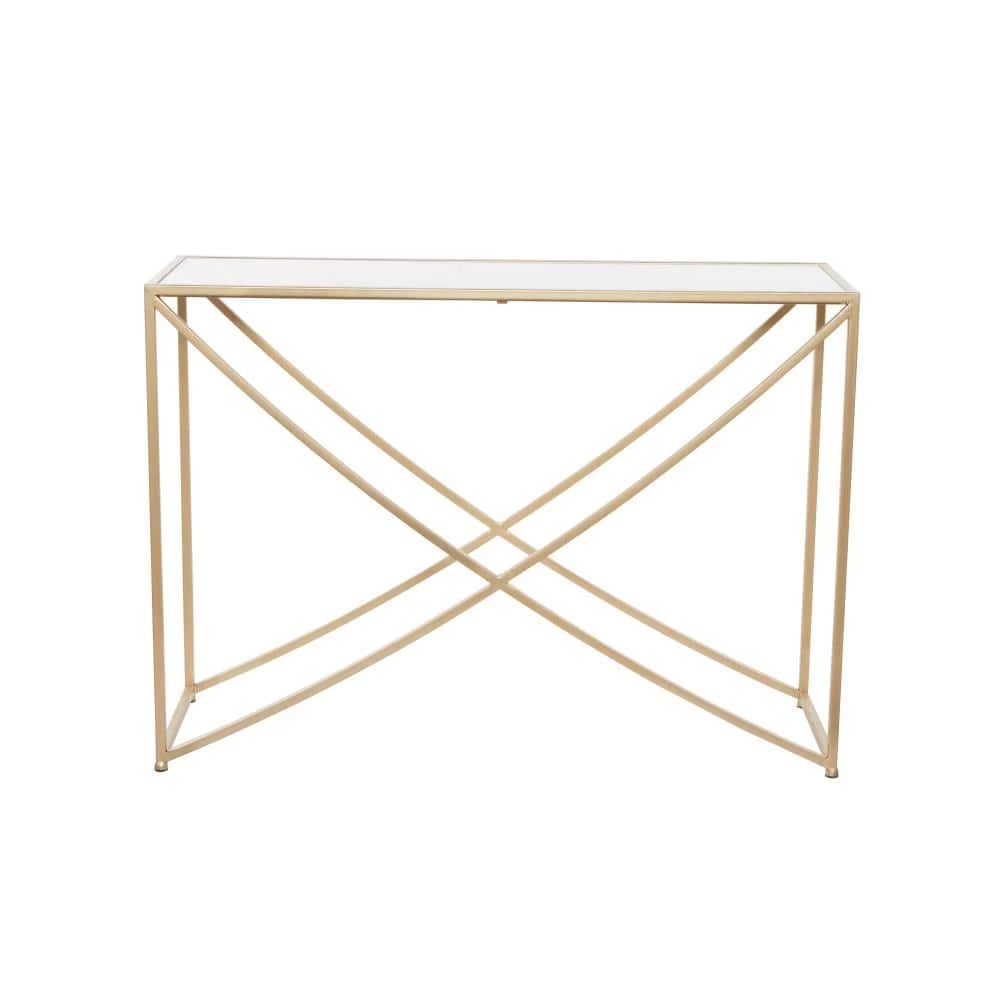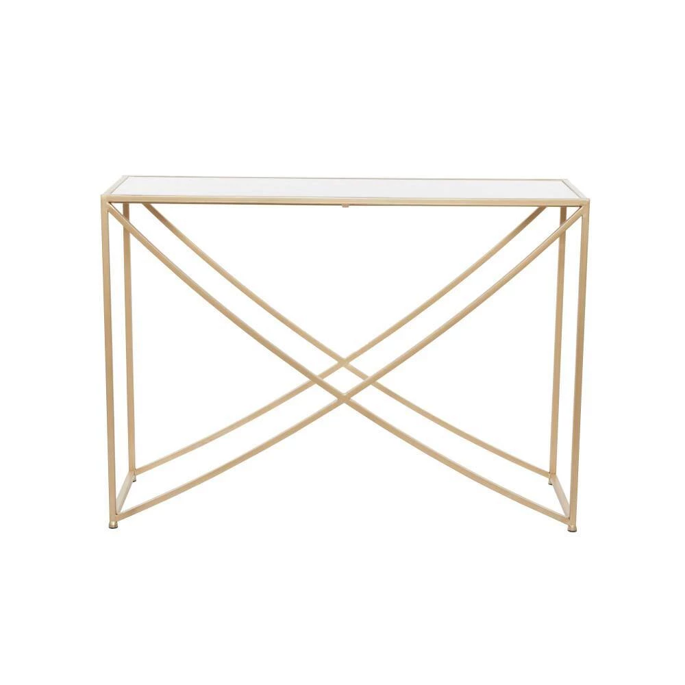 - This slim metal console table showcases a rectangular-shaped marble tabletop and features a captivating X-shaped leg design
