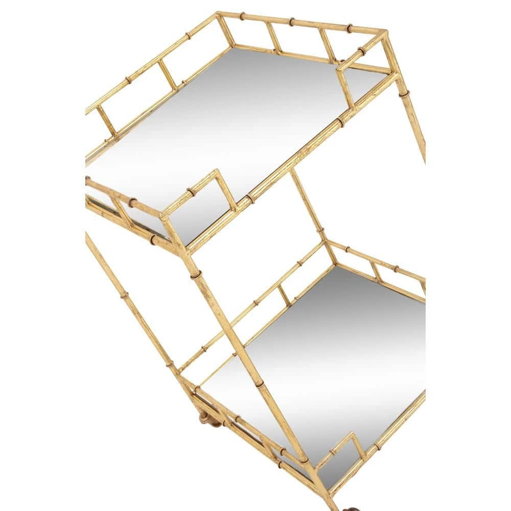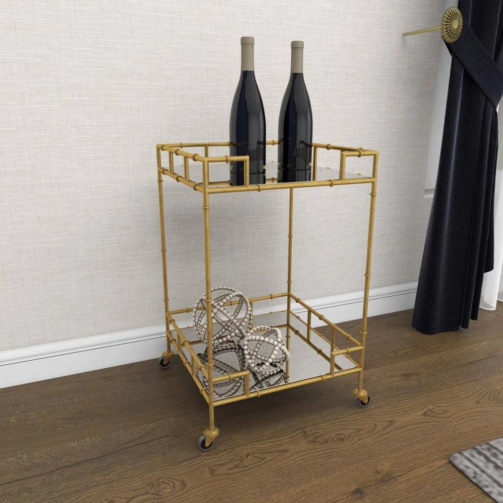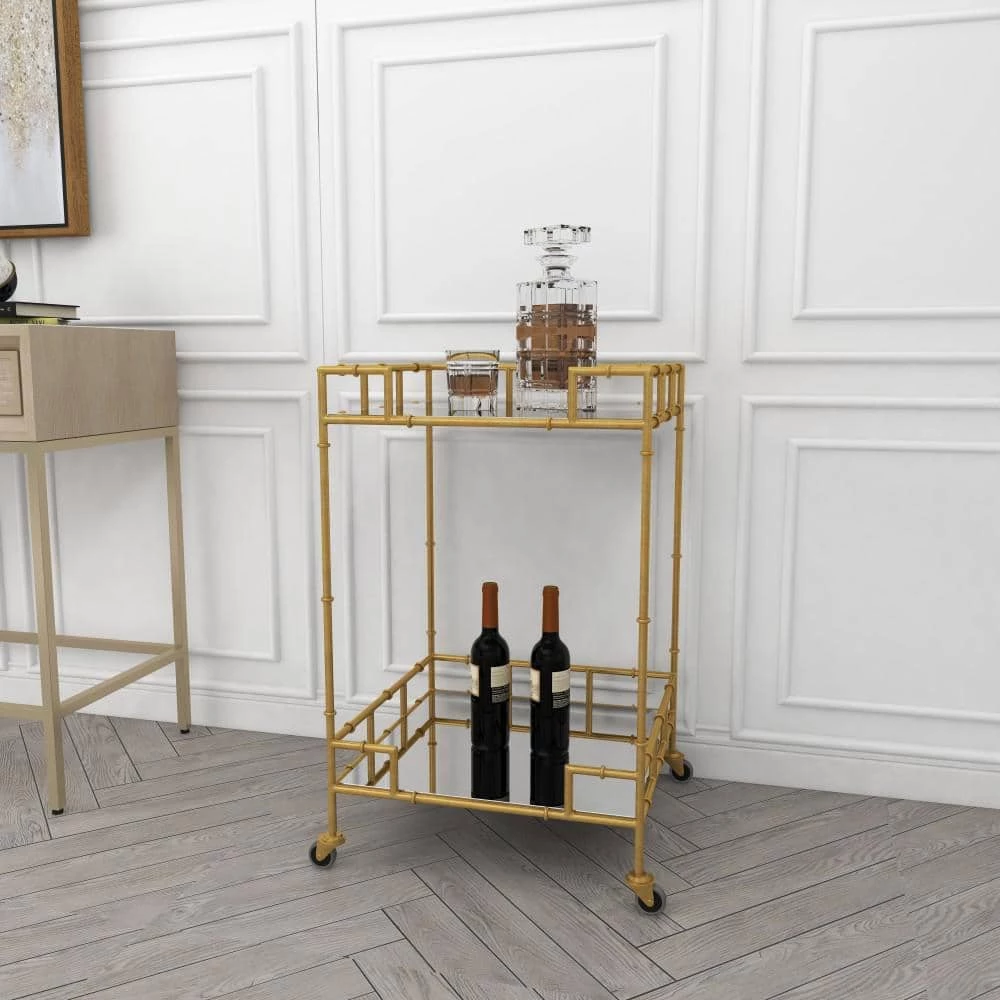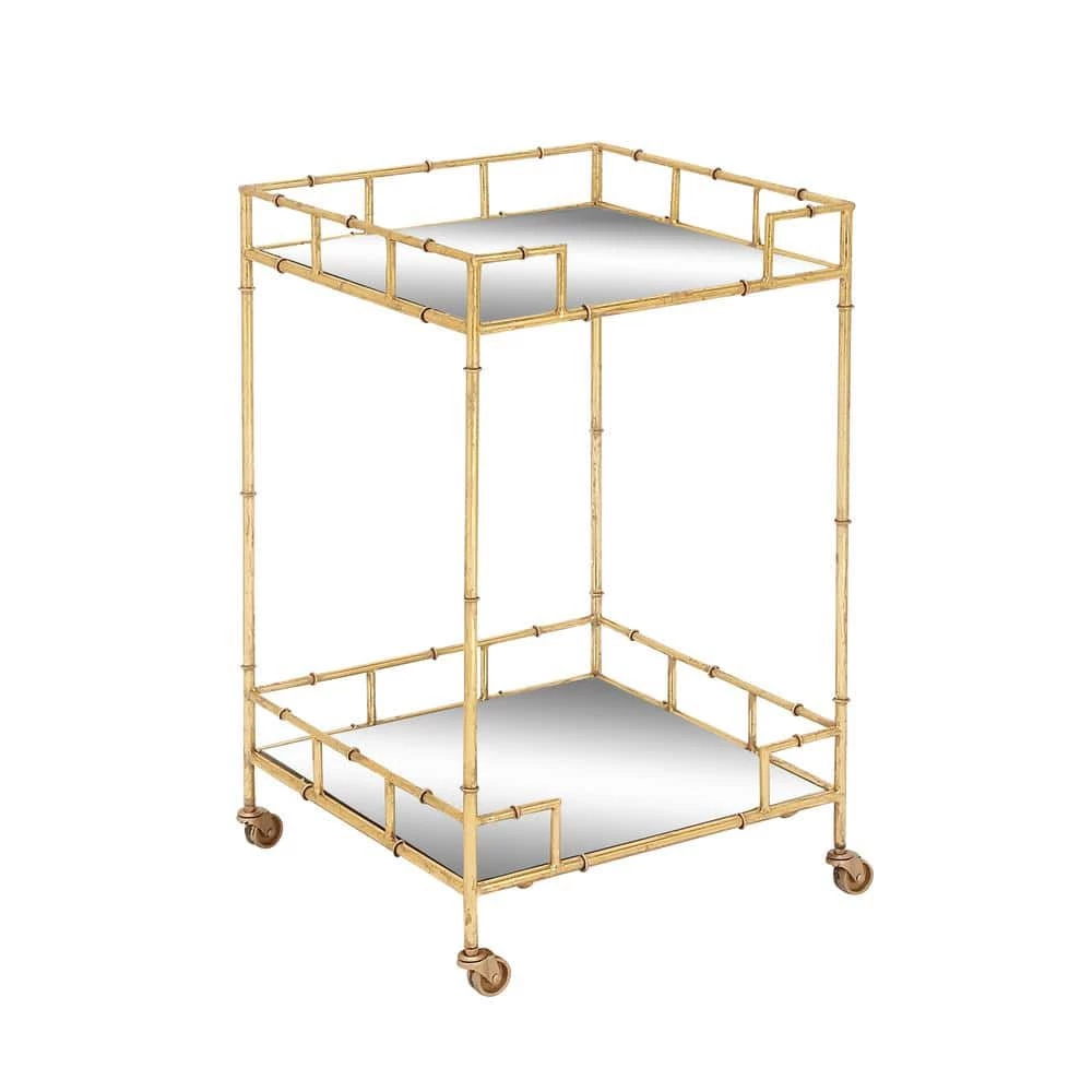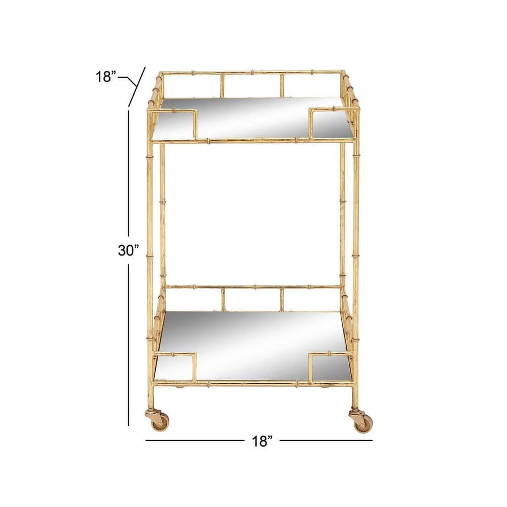 - Gold two tiered bar cart features a scaffolding inspired structure that supports spacious mirror shelves and smooth rolling wheels for optimal transport