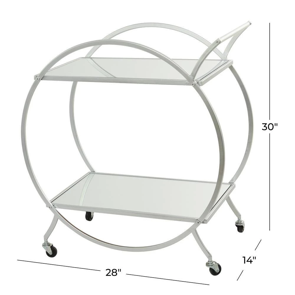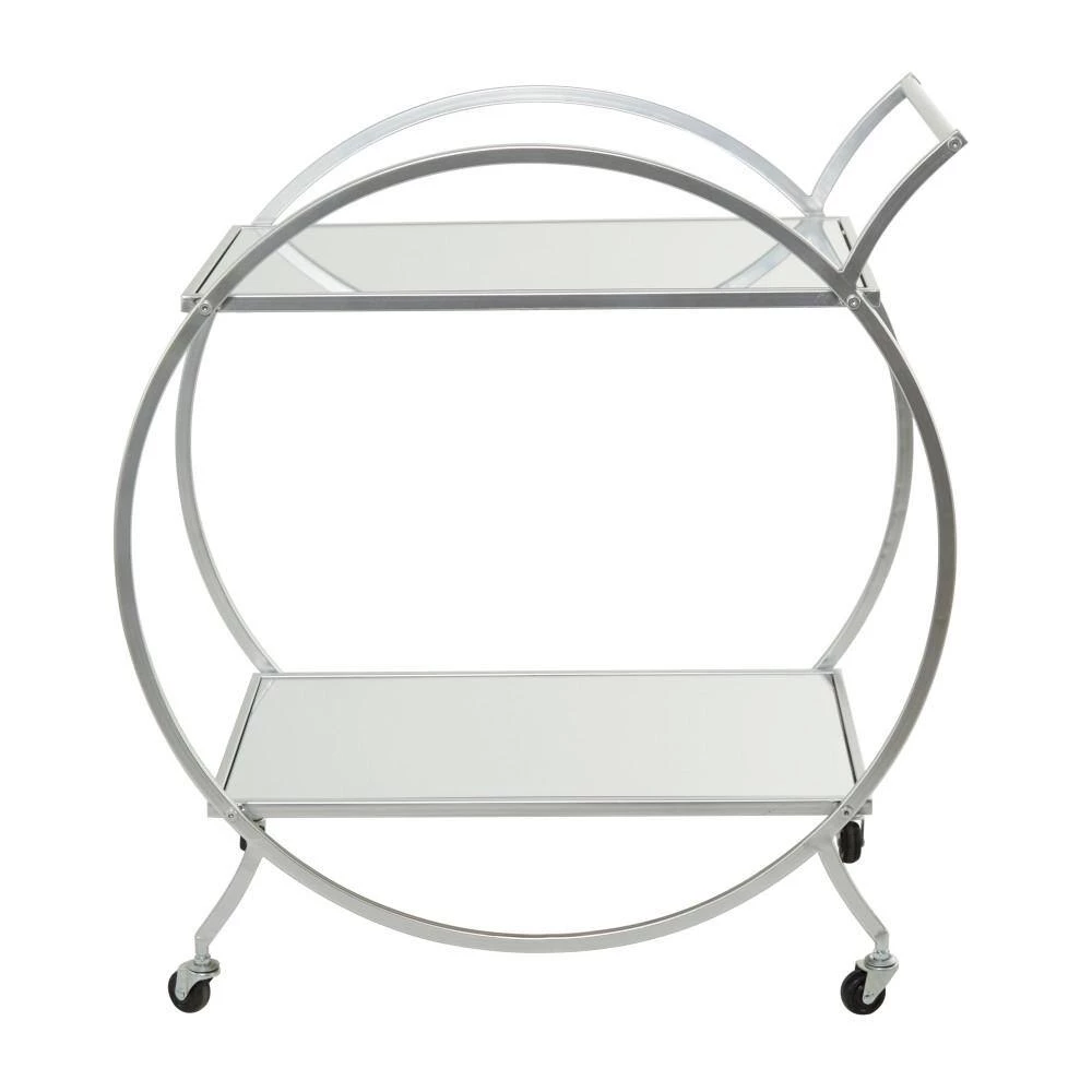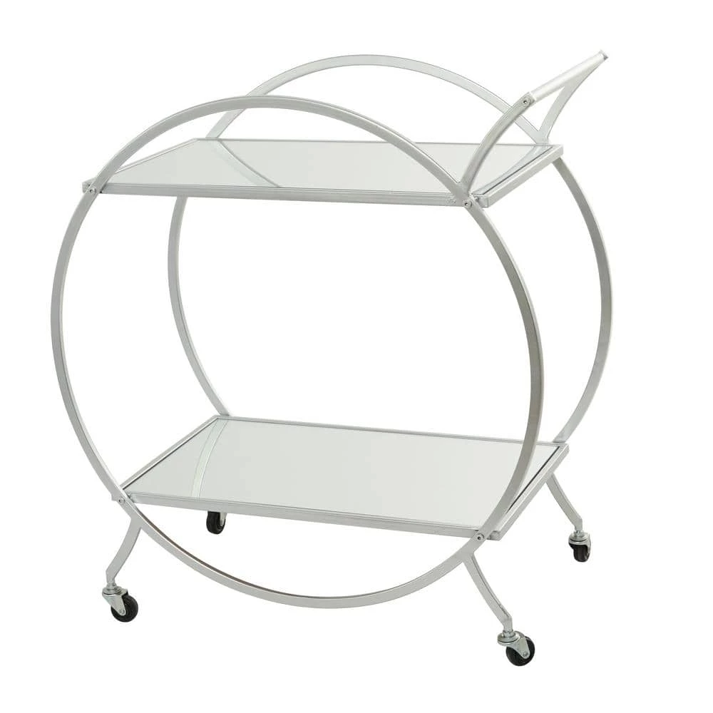 - A round silver rolling cart constructed of robust and quality iron and mirror materials