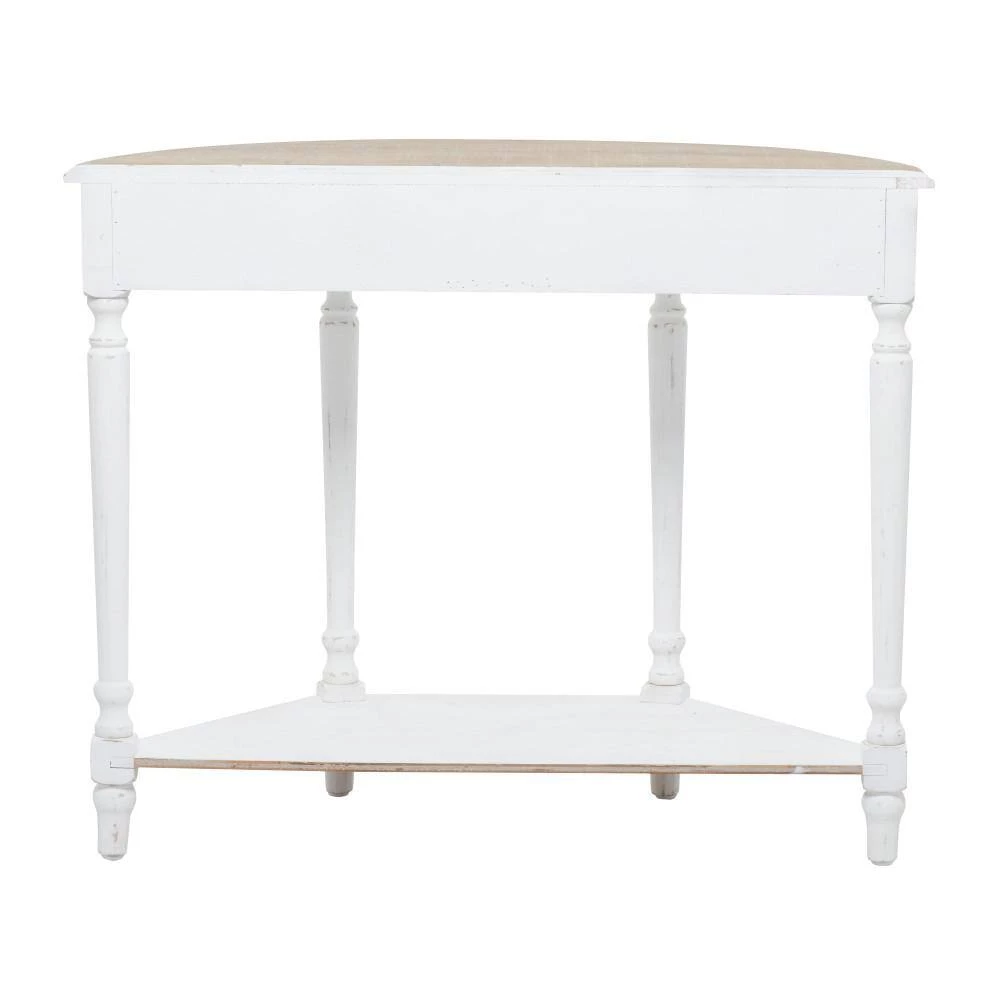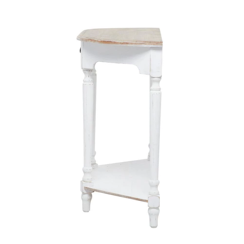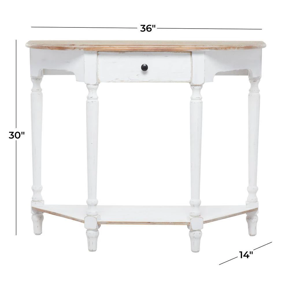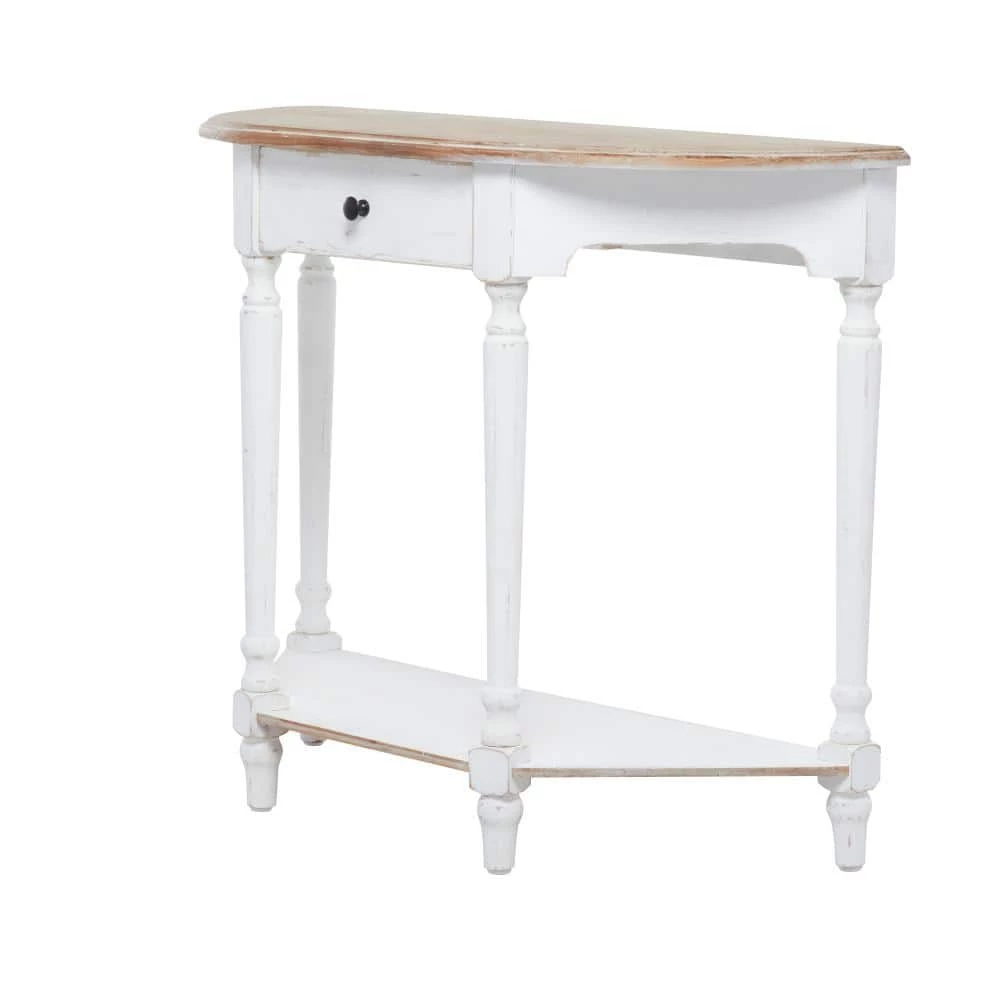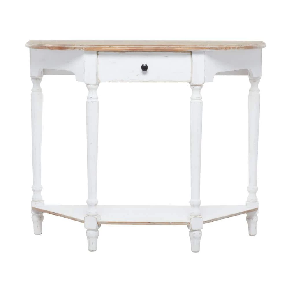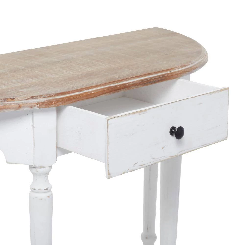 - This distressed brown and white console table accentuates flat wooden top, rectangular drawer with round handle knob, and open-designed trapezoidal frame