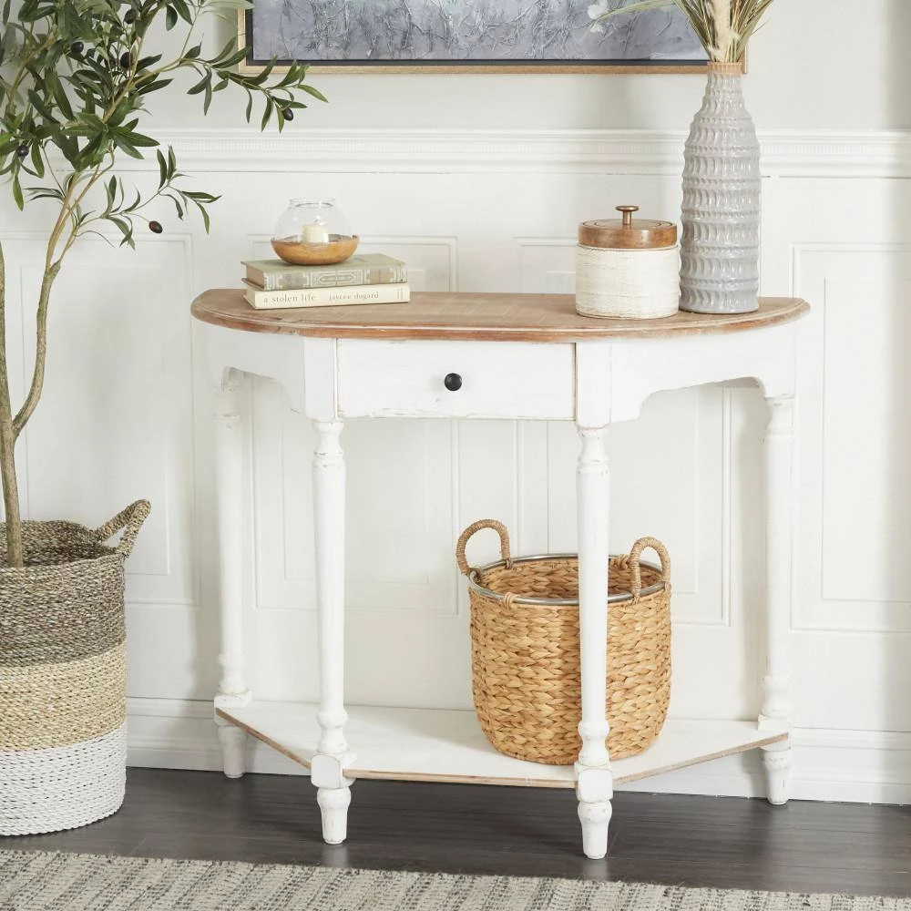 Bring a finishing touch to your home with an inviting appeal with this console table. A sturdy and long lasting construction for a years of enjoyment. This farmhouse console table with ample storage space will help keep your home organized and stylish. This item ships in 1 carton. Suitable for indoor use only. Maximum weight limit is 100 lbs.. It comes with a lower shelf. Farmhouse Design.