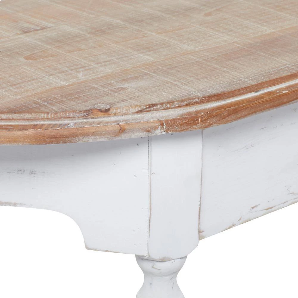 - This farmhouse console table features distressed brown and white finishes