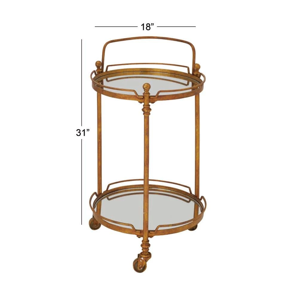 Looks stylish in your living room or kitchen as a serving tray or as a decor stand. An optimal mobility piece of furniture that will show to wow your guests for any occasion. Decorate this metal bar cart to store wine necessities or as side table to store your books, sculpture and potted plants for a creative display. This item ships in 1 carton. Fashioned in round metal frame with a conveniently-placed single handle. Suitable for indoor use only. Some assembly required. This bar cart can support up to 100 lbs.. A traditional rolling storage cart featuring 2 shelves with 16.62″ width and depth. Traditional style.